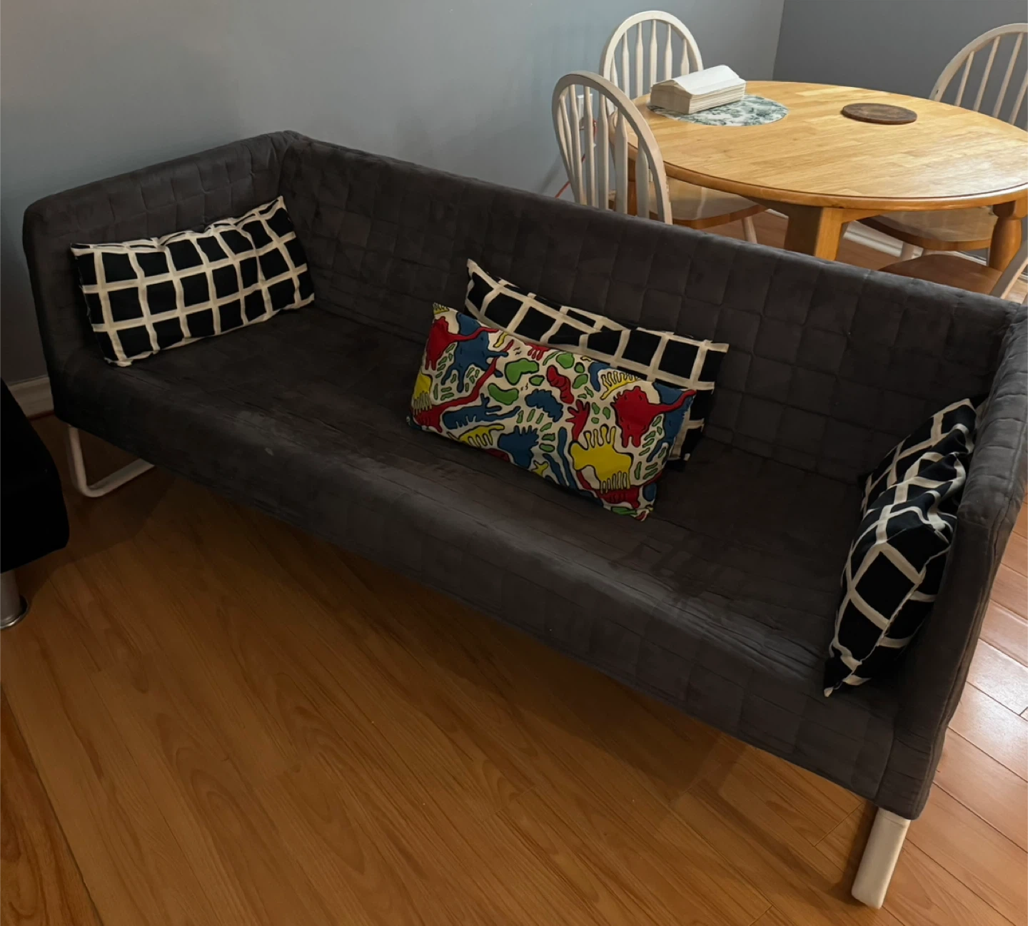 Selling a comfortable grey sofa. It's in good condition and comes with a few decorative pillows to add some style to your living space. Perfect for lounging and relaxing after a long day!