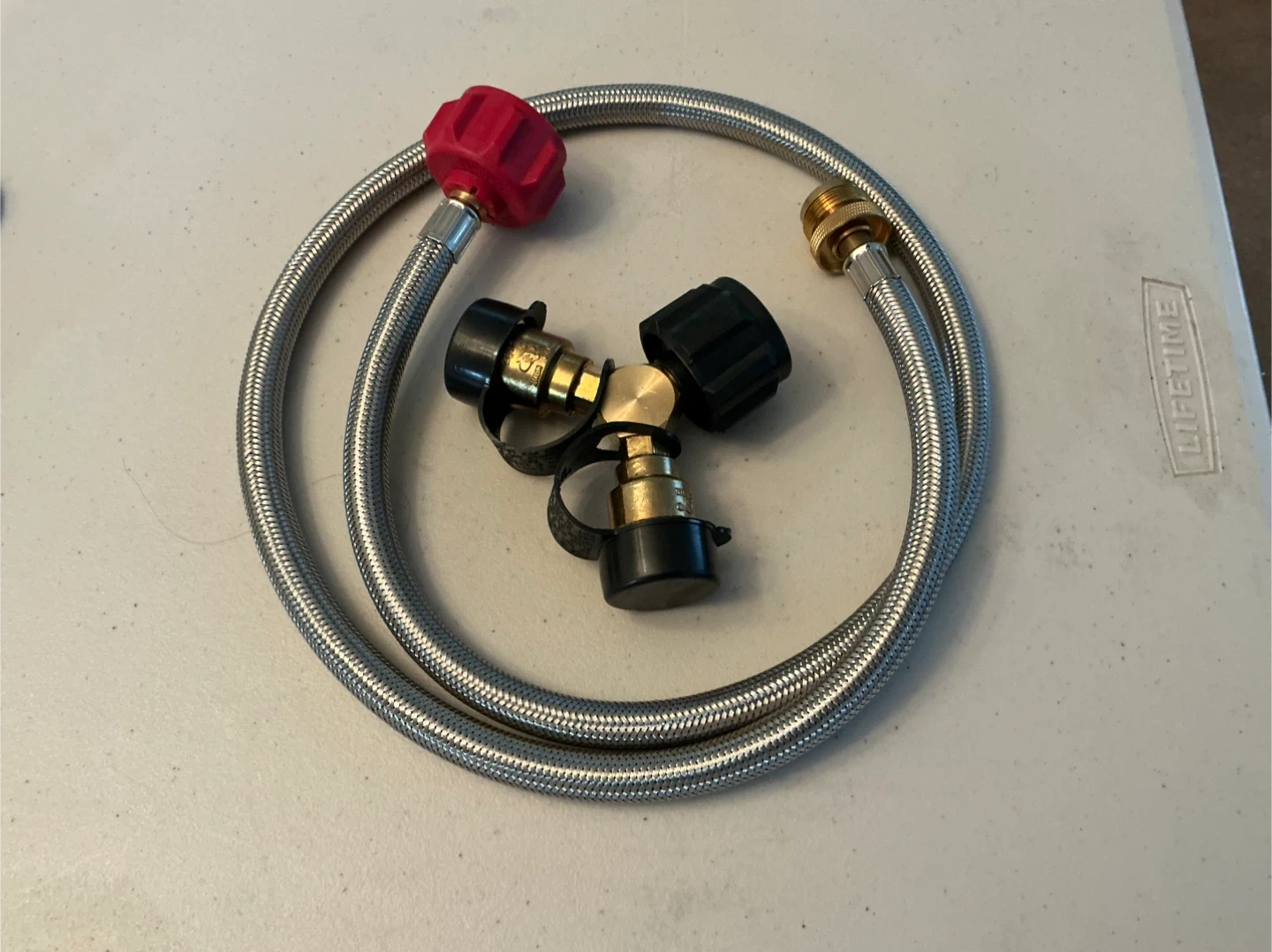 Coleman FyreSergeant 3-IN-1 HyperFlame propane camping stove. Dual burner for a total of 22,000 BTU. Instastart push button ignition. Cook and grill at the same time. Includes 10lb propane tank, braided steel hose and Y adapter.