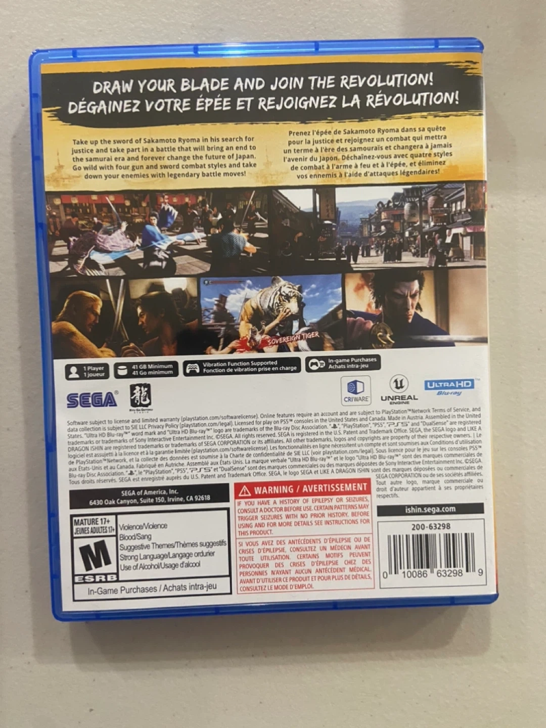 Selling Like a Dragon: Ishin! for the PS5. It's rated Mature 17+ and includes violence and blood. Get ready to draw your blade and join the revolution!