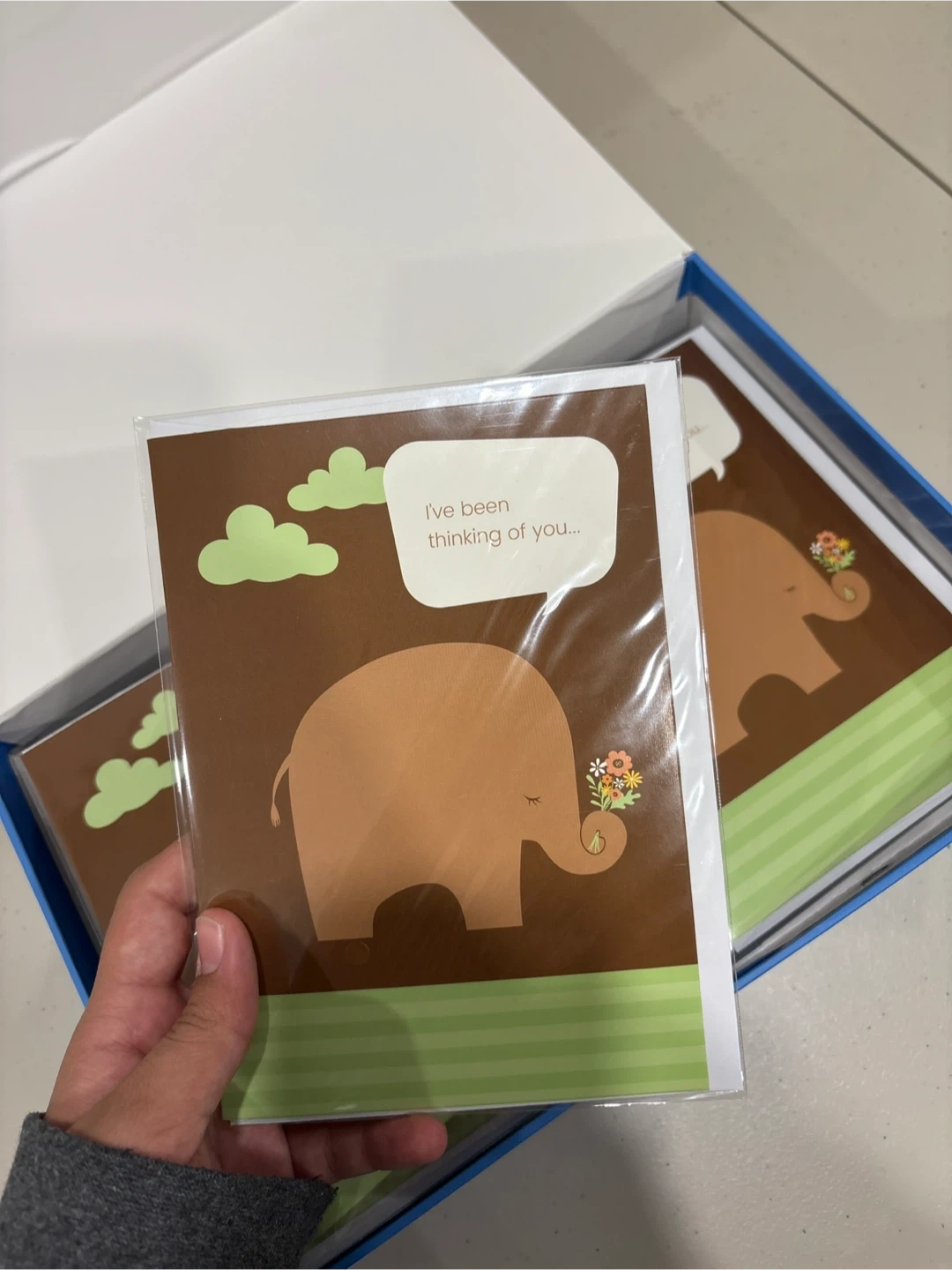 I have a x48 brand new 'Thinking of You' cards for sale! They feature a cute elephant design with clouds and flowers. Perfect for sending a thoughtful message to someone special