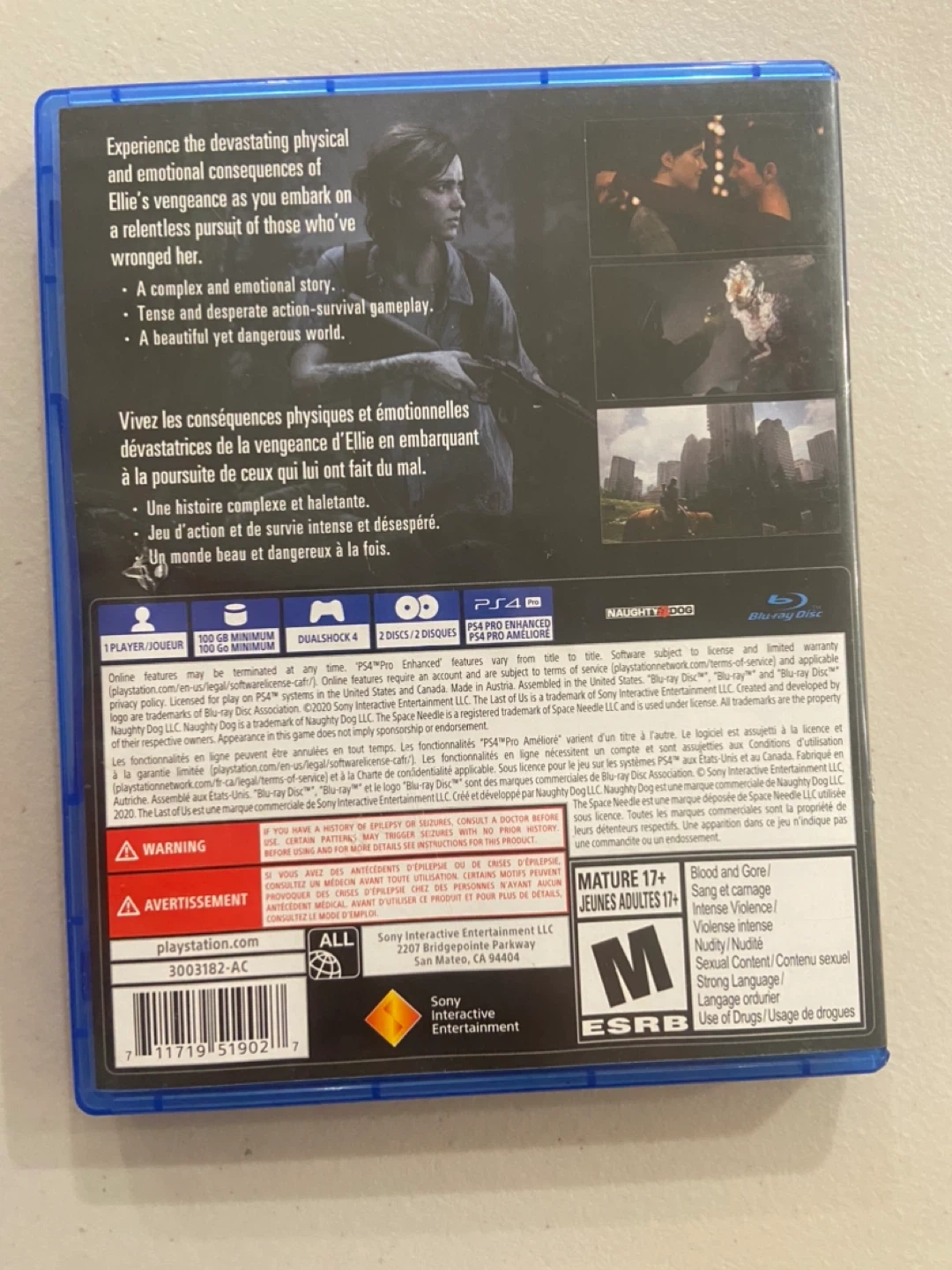 Selling The Last of Us Part II for the PS4! It's a complex and emotional story with tense and desperate action-survival gameplay. Rated Mature 17+ for blood and gore, intense violence, sexual content, strong language, and use of drugs/usage of drugs The graphics were actually insane on ps5 when I played, highly recommend this game, but you should play part 1 first.