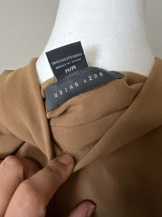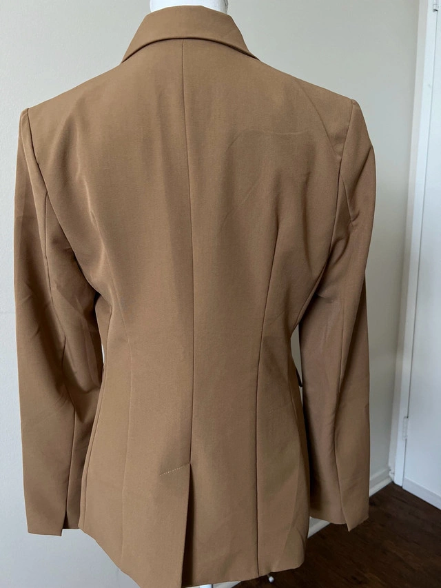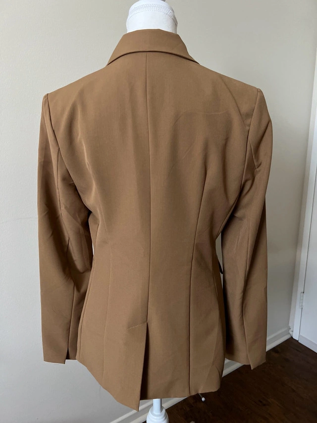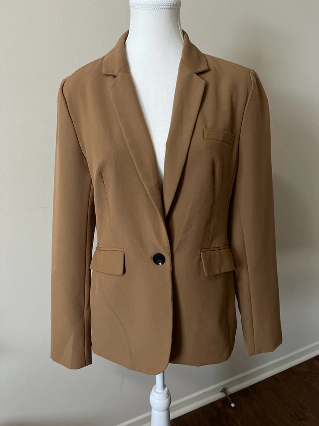 This is a stylish Suzy Shier blazer in a versatile brown colour, perfect for adding a touch of sophistication to any outfit. Being a used item, it has been worn with care and is in good condition. This blazer features a classic design with a notched lapel and a single-button closure. Additional Specifications: * Brand: Suzy Shier * Size: M * Colour: Brown * Style: Blazer