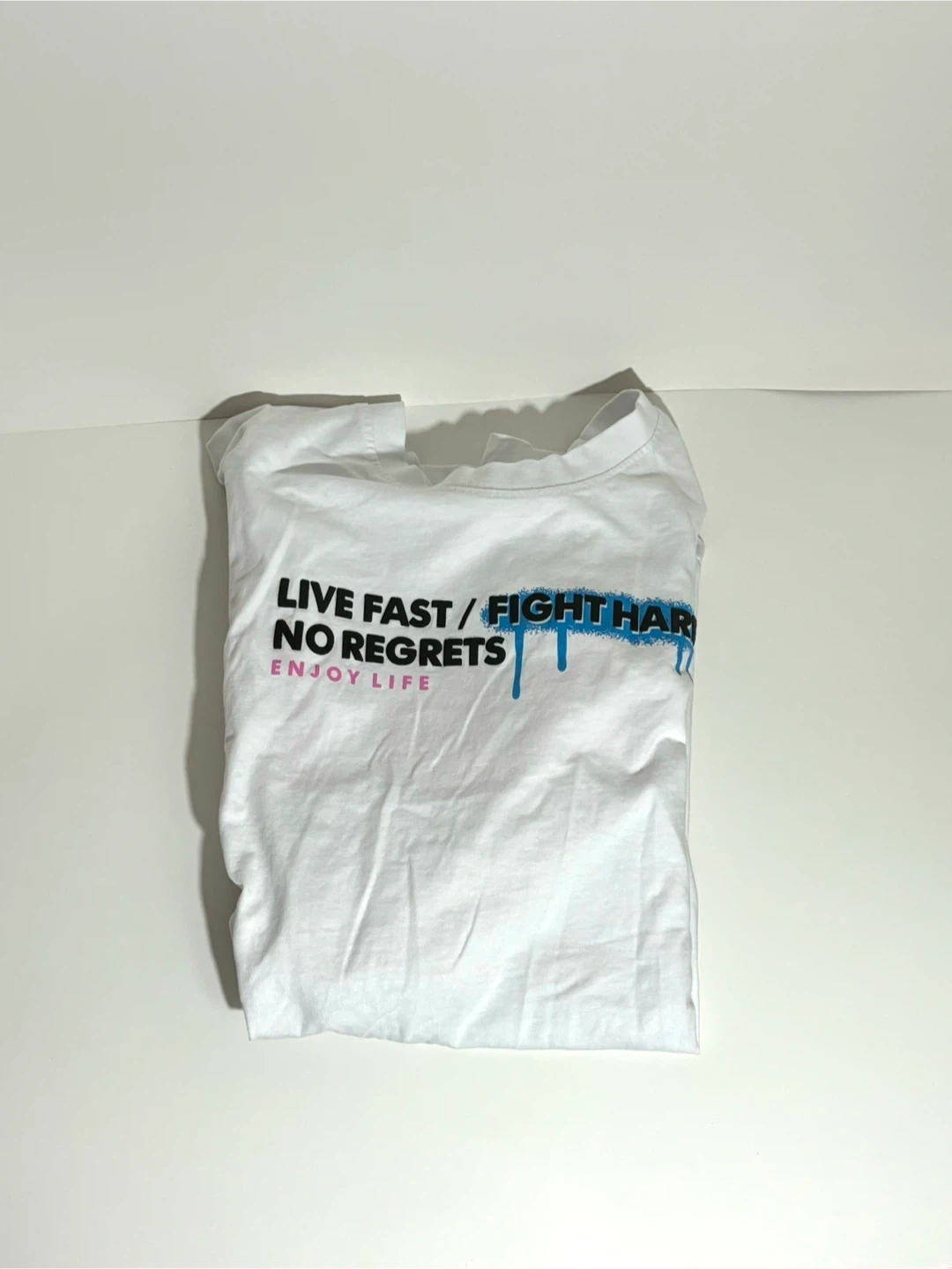 Selling a white graphic t-shirt with the print 'Live Fast/Fight Hard, No Regrets, Enjoy Life' on the front and 'Live Fast, Have Fun, No Regrets' on the back. It's in great condition and ready for a new home!