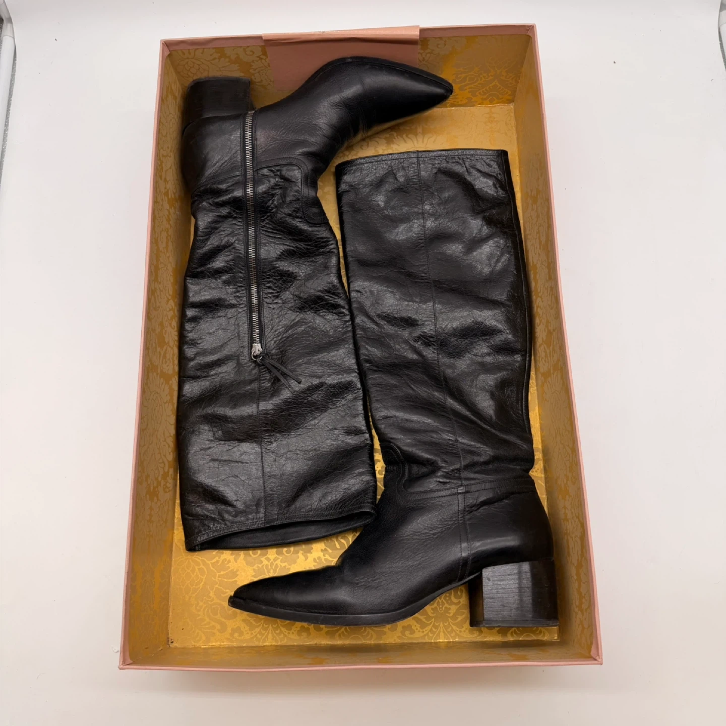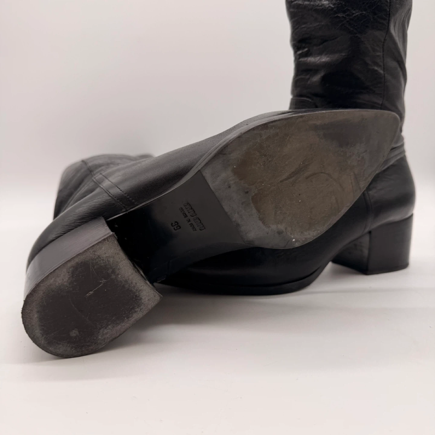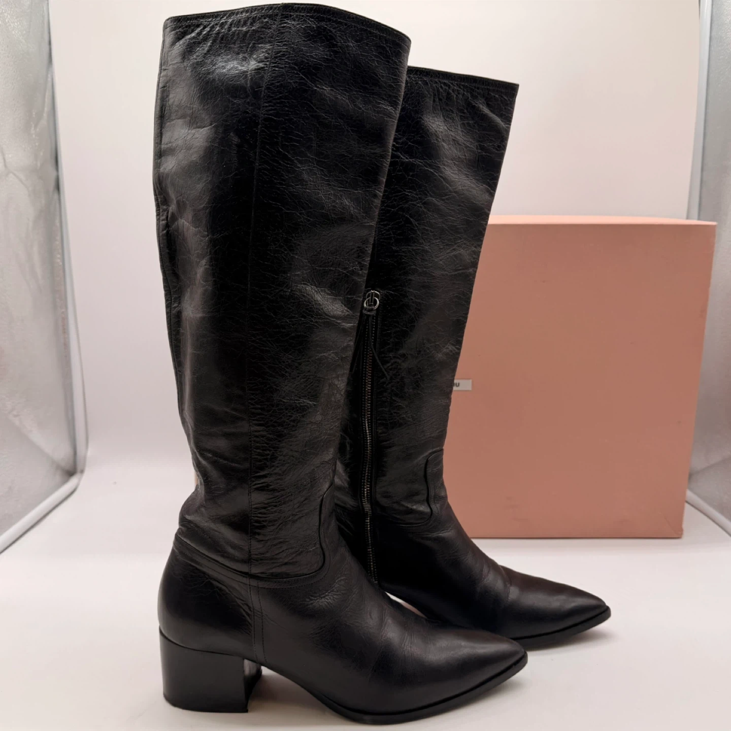 Beautiful Miu Miu genuine leather knee-high boots in sleek black color. • Size: EU 39 / US 8–8.5 • Material: Vitello Shine leather (high-quality Italian leather) • Heel height: approx. 2.25 inches (5.5 cm) • Boot height: approx. 16 inches (40 cm) • Made in Italy • Side zipper closure • Original box included (purchased at Holt Renfrew, retail price $990 CAD) • Excellent pre-owned condition with very light sole wear (see photos). ✨ Stylish, timeless, and comfortable — perfect for fall and winter looks! 📍 Pickup in North York or shipping available. 15 up
