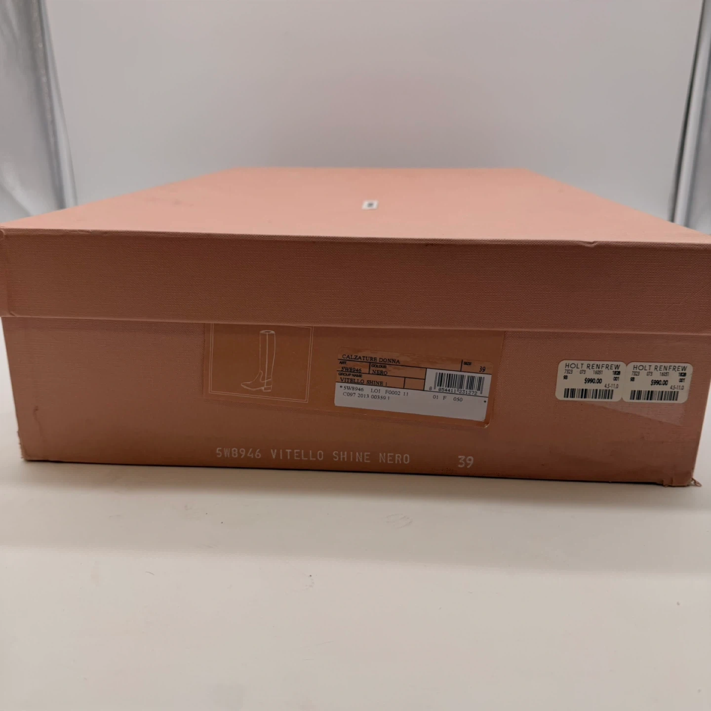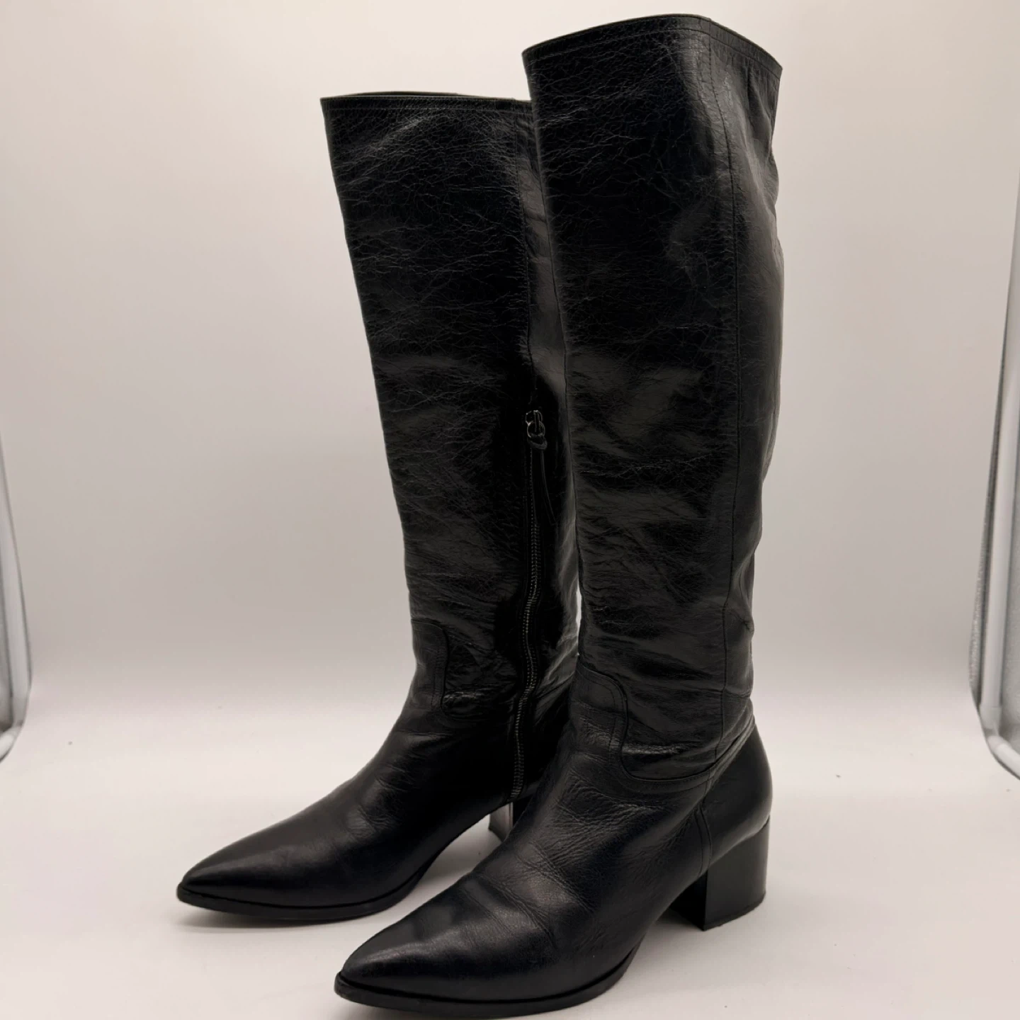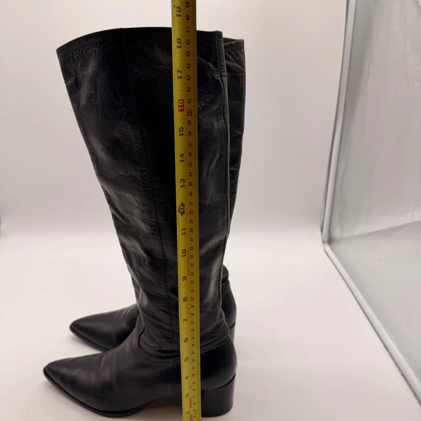 Beautiful Miu Miu genuine leather knee-high boots in sleek black color. • Size: EU 39 / US 8–8.5 • Material: Vitello Shine leather (high-quality Italian leather) • Heel height: approx. 2.25 inches (5.5 cm) • Boot height: approx. 16 inches (40 cm) • Made in Italy • Side zipper closure • Original box included (purchased at Holt Renfrew, retail price $990 CAD) • Excellent pre-owned condition with very light sole wear (see photos). ✨ Stylish, timeless, and comfortable — perfect for fall and winter looks! 📍 Pickup in North York or shipping available. 15 up