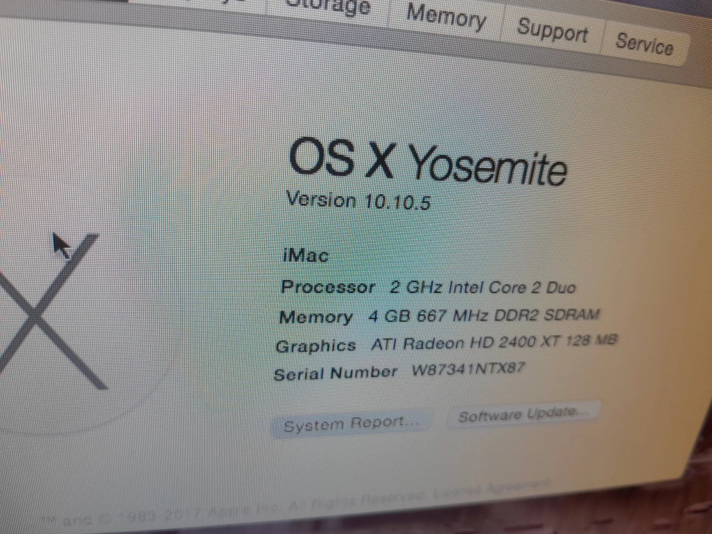 Selling an Apple iMac running OS X Yosemite. It has a 2 GHz Intel Core 2 Duo processor, 4 GB 667 MHz DDR2 SDRAM, and ATI Radeon HD 2400 128 MB graphics. Serial number is W87341NTX87