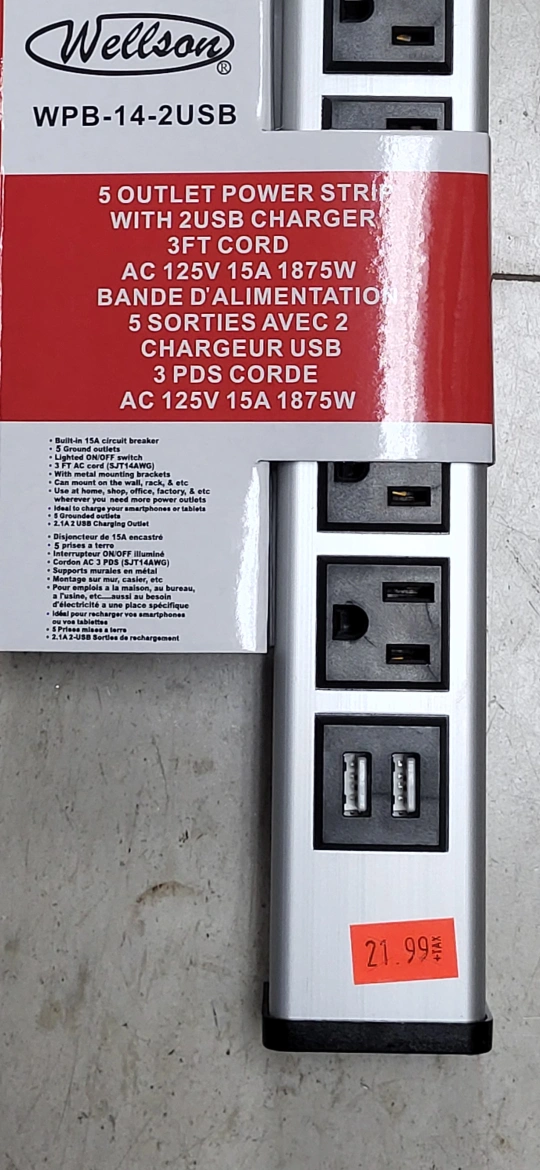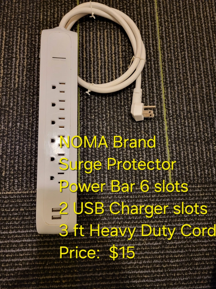 Selling a white NOMA surge protector power bar with blue power light. Have 6 of 130V outlets and 2 USB charger ports. It has a 3 ft heavy duty cord. Also i have one Black one, please see other pictures. Original price is way more +tax. Here is priced only $15 each.