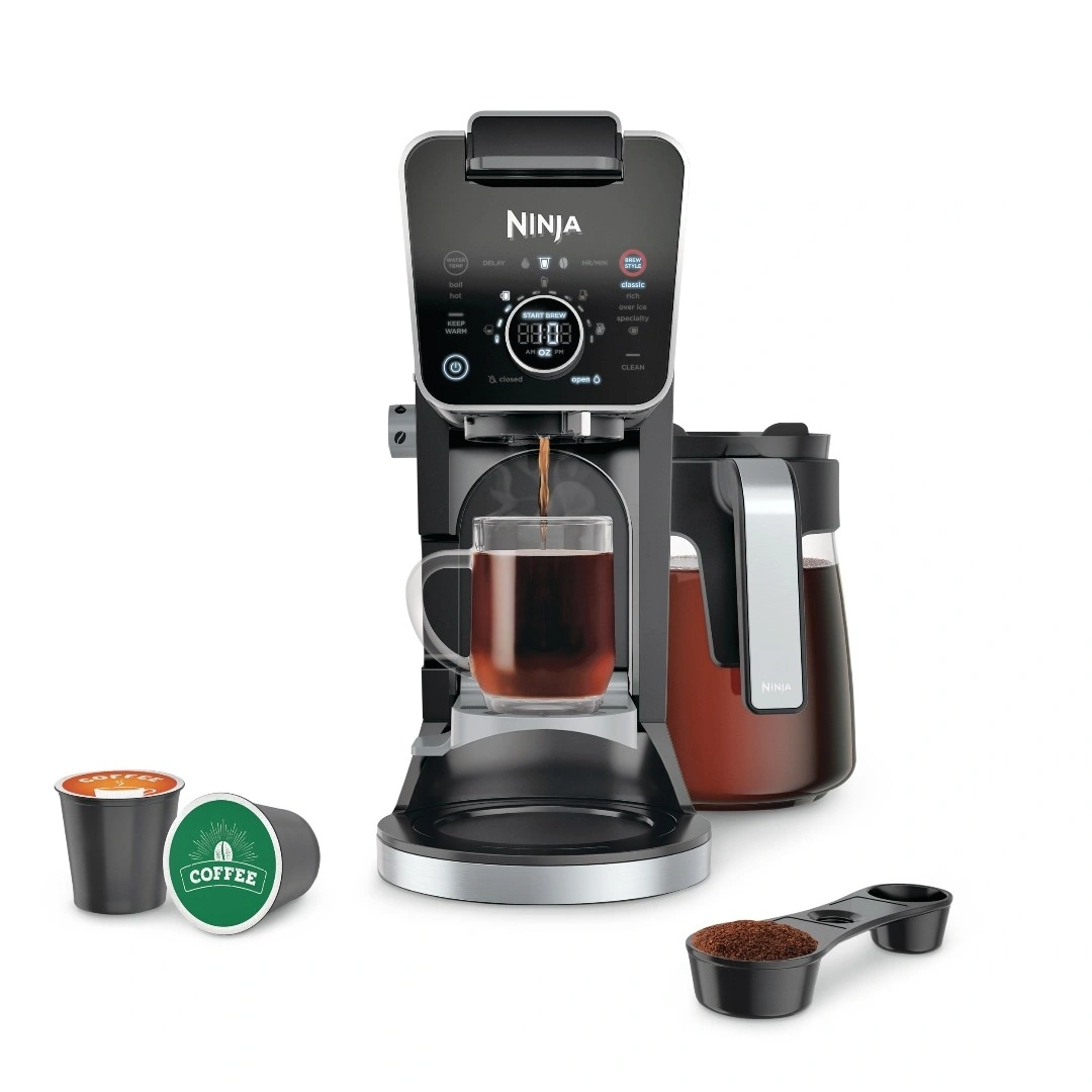 Ninja DualBrew Pro is a combination coffee maker that allows users to brew using coffee grounds or K-Cup style pods. It supports multiple brew sizes and styles, includes programmable features (clock/timer, auto-off, etc.), and has tools for hot water dispensing and milk frothing. It is designed to be flexible for both single-serve convenience and larger pot brewing. 🔧 Key Features Feature Details Dual Mode Brewing Can use ground coffee or K-Cup style pods. The machine has adapters for each. Multiple Brew Styles “Classic”, “Rich”, “Over Ice”, and “Specialty” settings. Variety of Brew Sizes For grounds: 9 size options (from small cup up to full carafe). For pods: 4 pod sizes (6, 8, 10, or 12 oz). Specialty Brew / Concentrate A setting for brewing a stronger or more concentrated coffee (useful for lattes, cappuccinos, etc.) Independent Hot Water System Separate spout/system for hot water (for tea, soups, etc.), with two temperature settings: “Hot” and “Boil”. Prevents flavor cross-contamination from the main brew. Built-in Frother Fold-away frother for hot or cold milk / milk alternatives. Removable for cleaning. Reservoir & Carafe 60-oz (about 1.77 liters) removable, multi-position water reservoir (can be placed on the side or back). Comes with a 12-cup glass carafe. Programmability / Convenience Features Programmable clock/timer, delay-brew features, automatic shut-off, “clean” function, water level indicator.