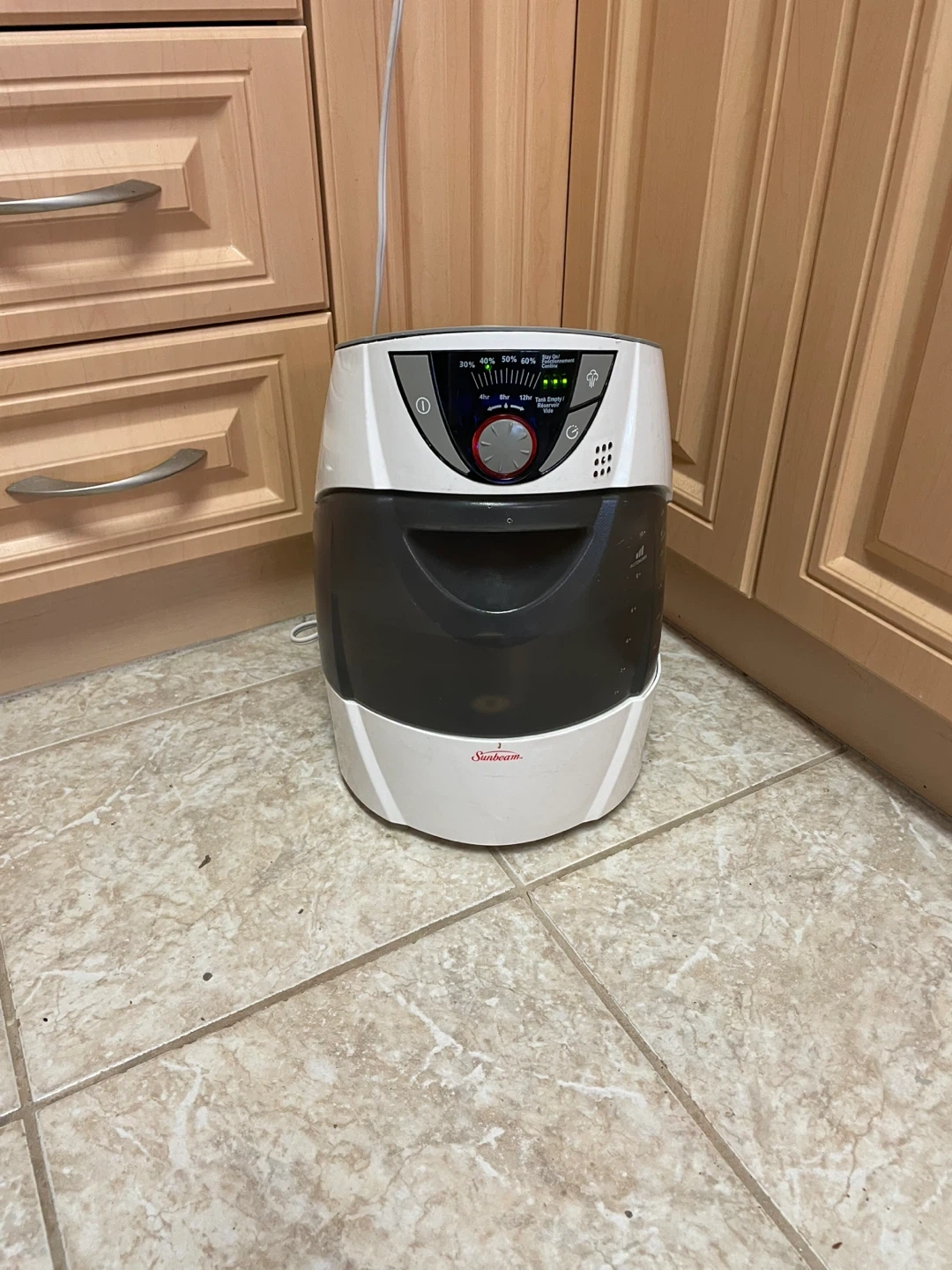 Selling a Sunbeam humidifier. It has different settings for humidity levels (30%, 40%, 50%, 60%) and run times (4hr, 8hr, 12hr). Also has a tank empty indicator.