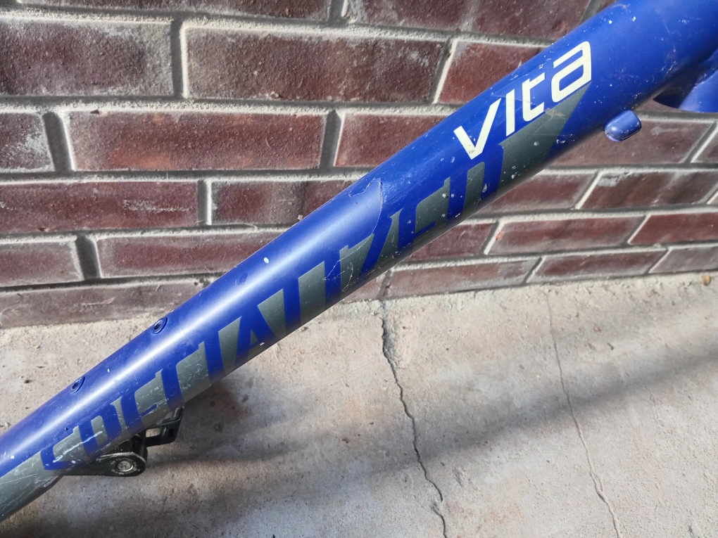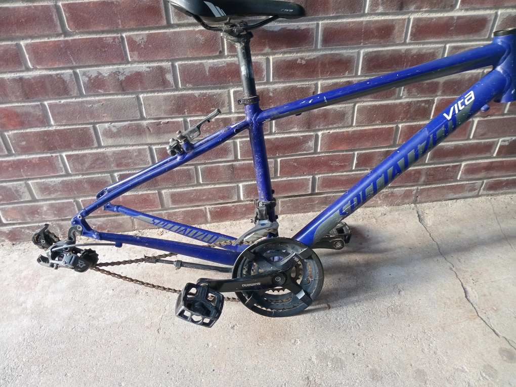 Selling a Specialized Vita bike frame. It's blue and has some wear and tear, as you can see in the photos. Comes with the seat, pedals, and chain. Perfect for a DIY project or replacing a damaged frame! Asking $65