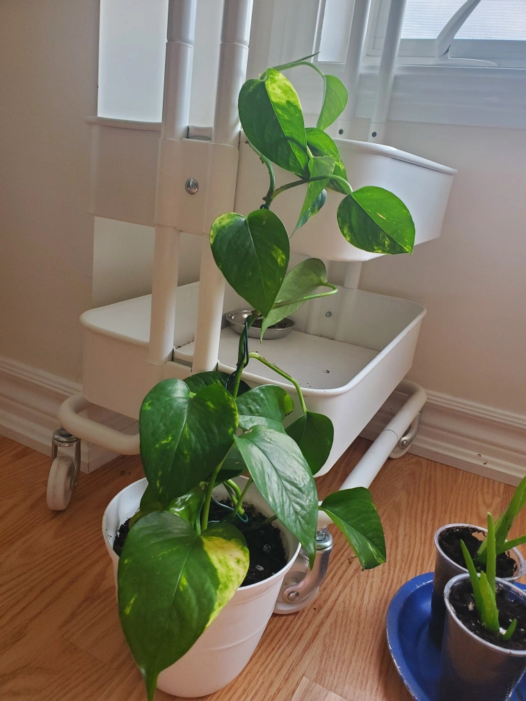 Selling a healthy golden pothos plant in a white pot. It's a beautiful and easy-to-care-for houseplant that will add a touch of green to your home. The leaves have a lovely marbled pattern.