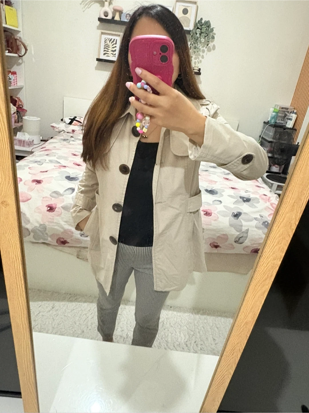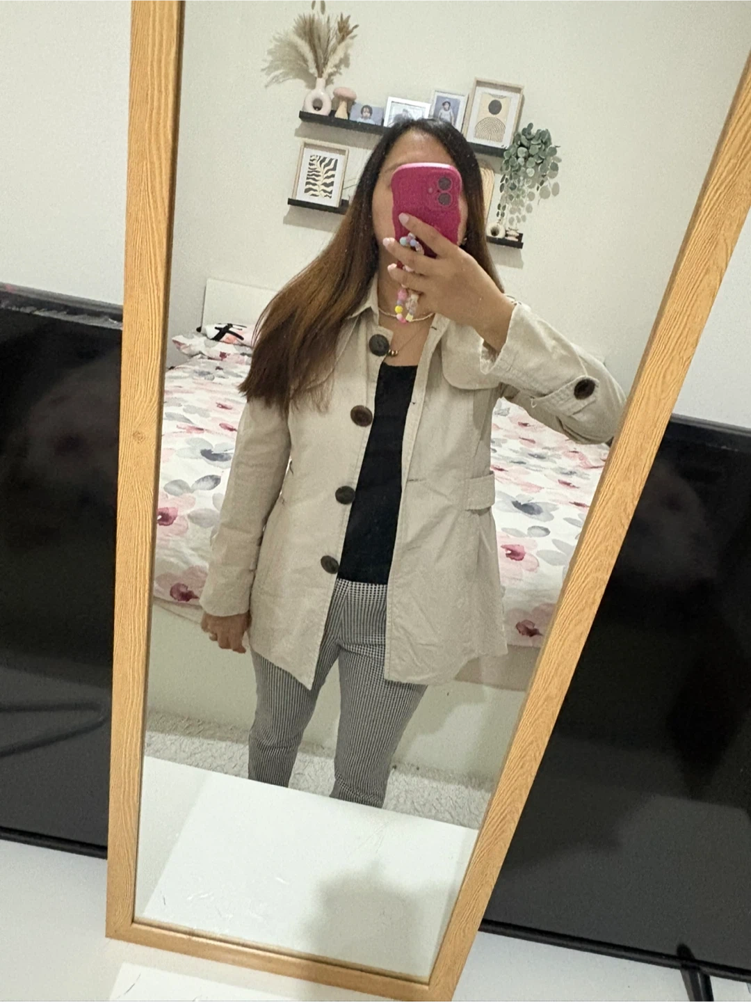 A cute beige trench coat perfect for layering! It has a classic design with button details and a comfortable fit. Great for spring or fall weather. Small size but can fit up to medium.