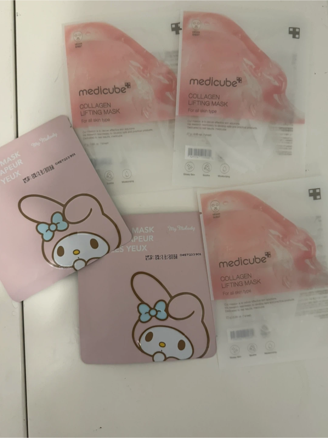 I'm selling a mix of face masks! You'll get Medicube Collagen Lifting Masks designed for all skin types, plus My Melody Masks. The Medicube masks are vegan sheet type masks. Expiration dates for the My Melody masks are December 1, 2025, and the Medicube masks are great for moisturizing and giving your skin a glossy sheen