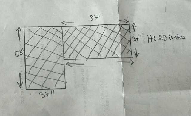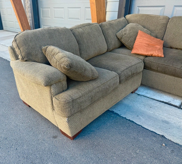 Olive Green Bauhaus 2-Piece Sectional Sofa – Great Condition. Gently used, soft textured fabric. Very comfortable and sturdy. From a pet- and smoke-free home. Pieces come apart for easy transport, and the cushions are removable. Includes 3 throw pillows. You’re welcome to view before buying. Let me know if you're interested!