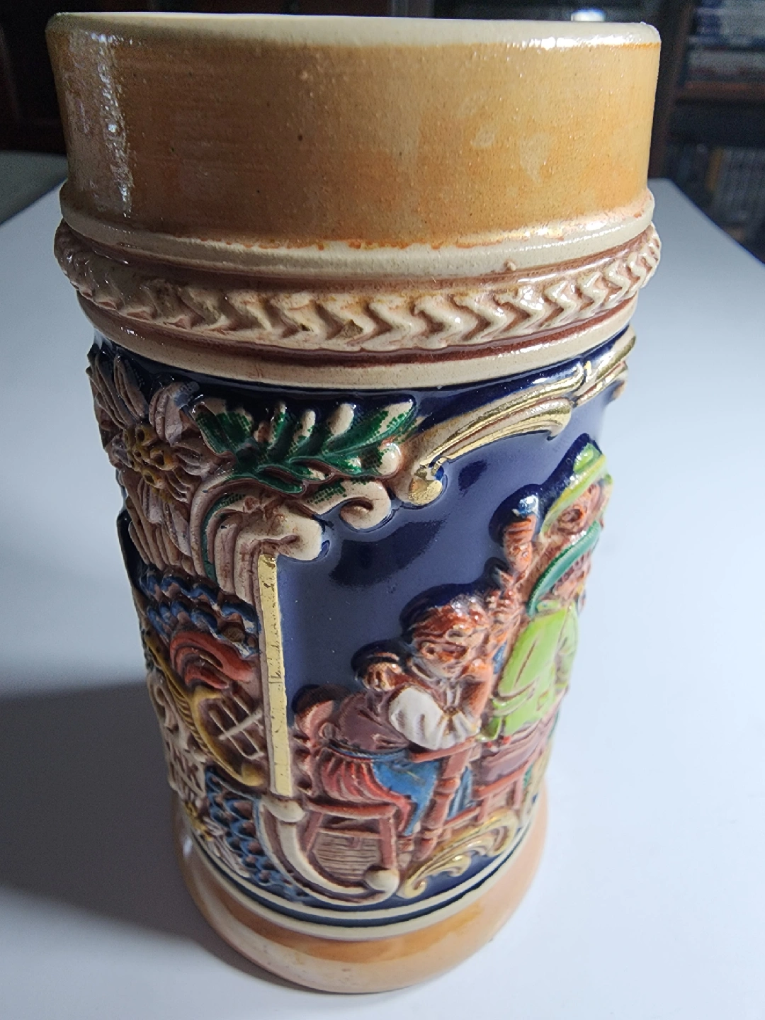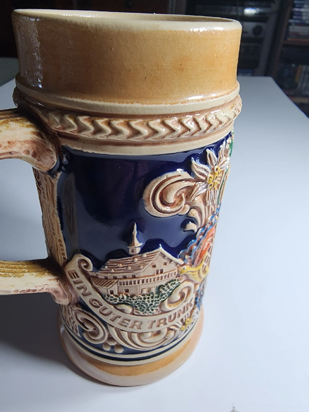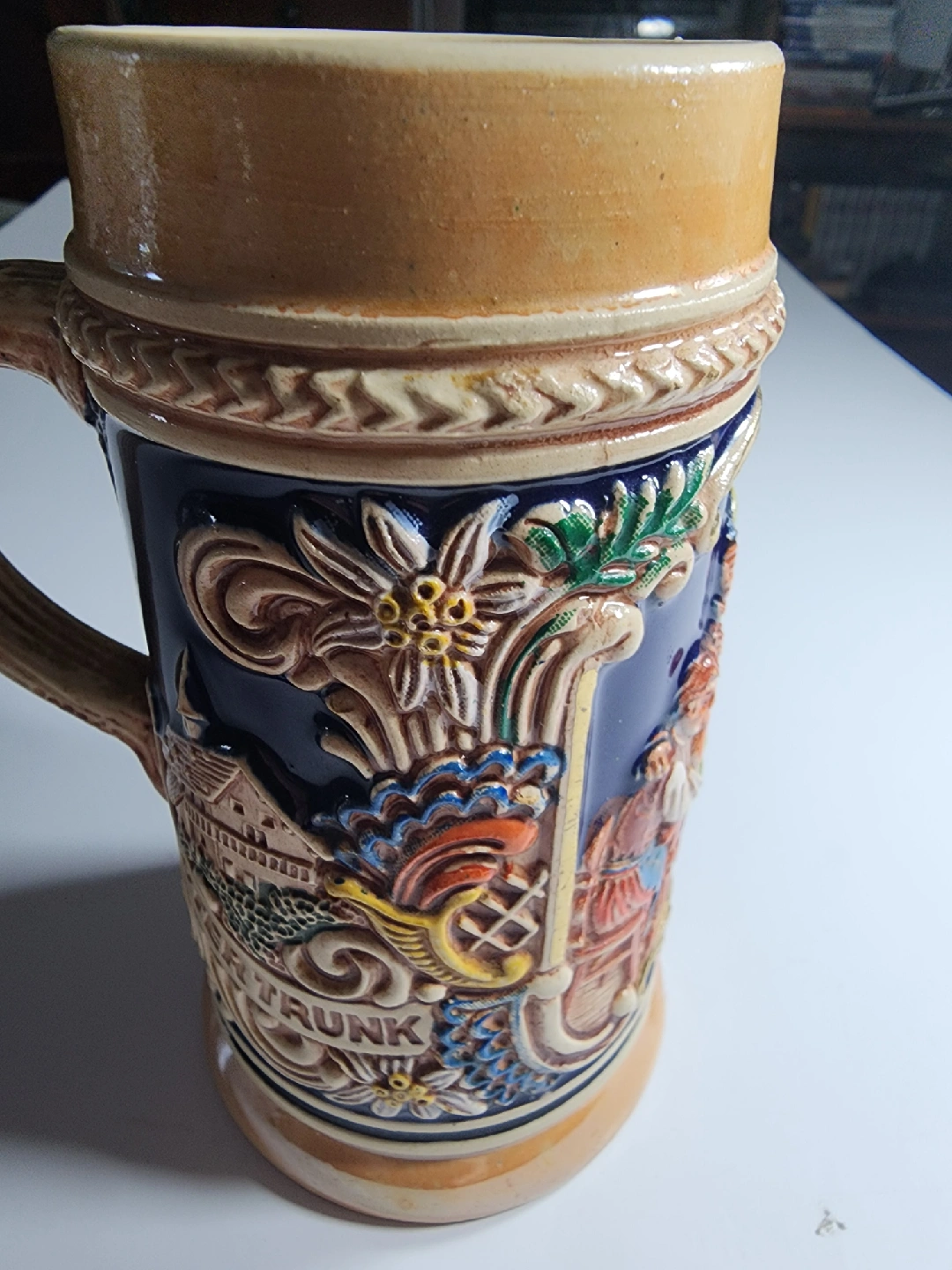 Selling a vintage German beer stein mug! It features a detailed relief design with people in traditional clothing and a castle scene. The mug is predominantly blue and beige with gold accents. "IN FROHER RUND" is written on the mug.
