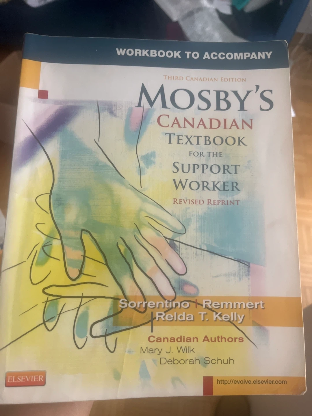Selling a copy of Mosby's Canadian Textbook for the Support Worker, Third Canadian Edition. It's a workbook to accompany the textbook and is a revised reprint. Authors include Sorrentino, Remmert, and Relda T Kelly, with Canadian authors Mary J. Wilk and Deborah Schuh