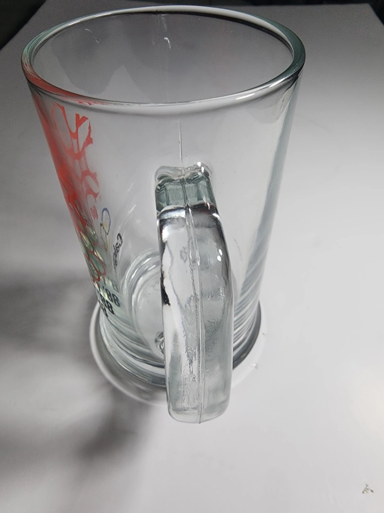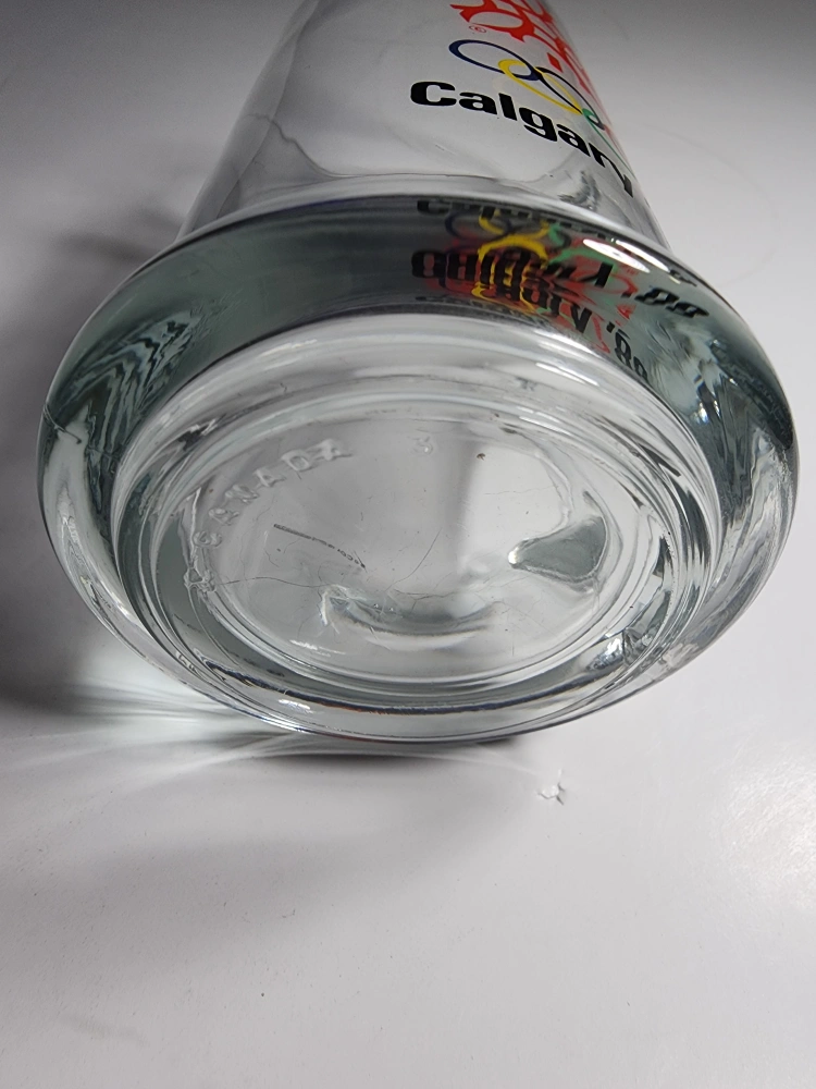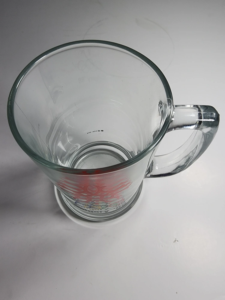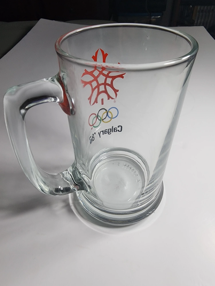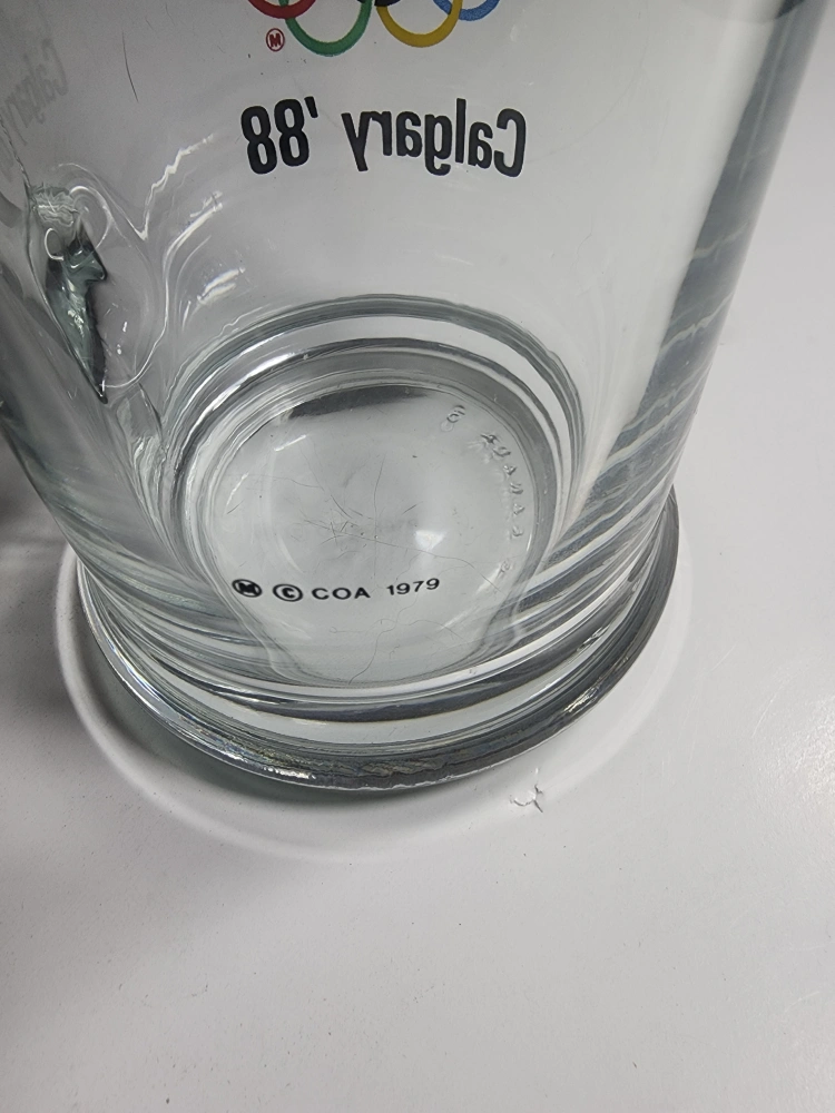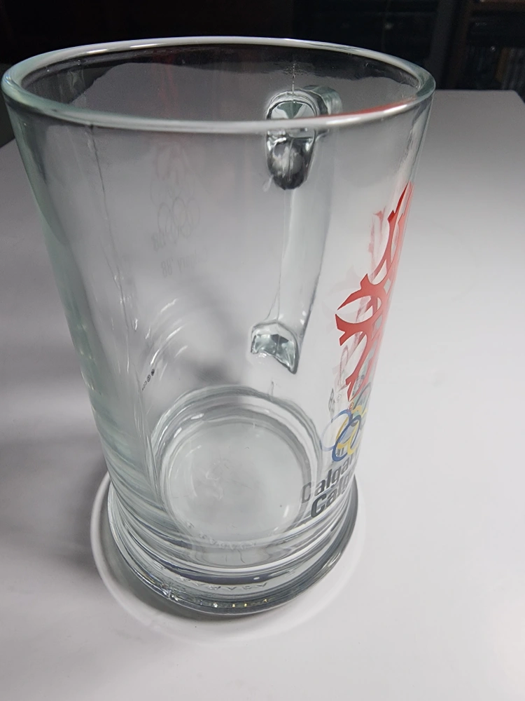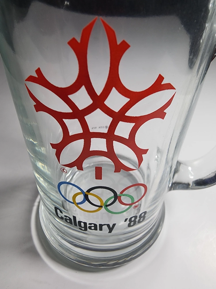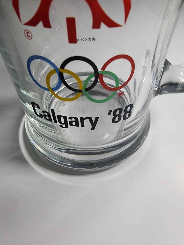 Selling a clear glass mug commemorating the 1988 Calgary Olympics! It features the iconic Olympic rings and a stylized maple leaf design. A great piece of memorabilia for any collector or sports fan