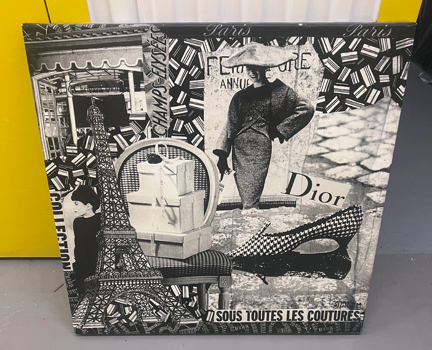 I didn't take measurements! Sorry! Will update asap. Medium size canvas (approx 3' x 3') of black and white fashion images in a collage. Would be great in a dressing room!