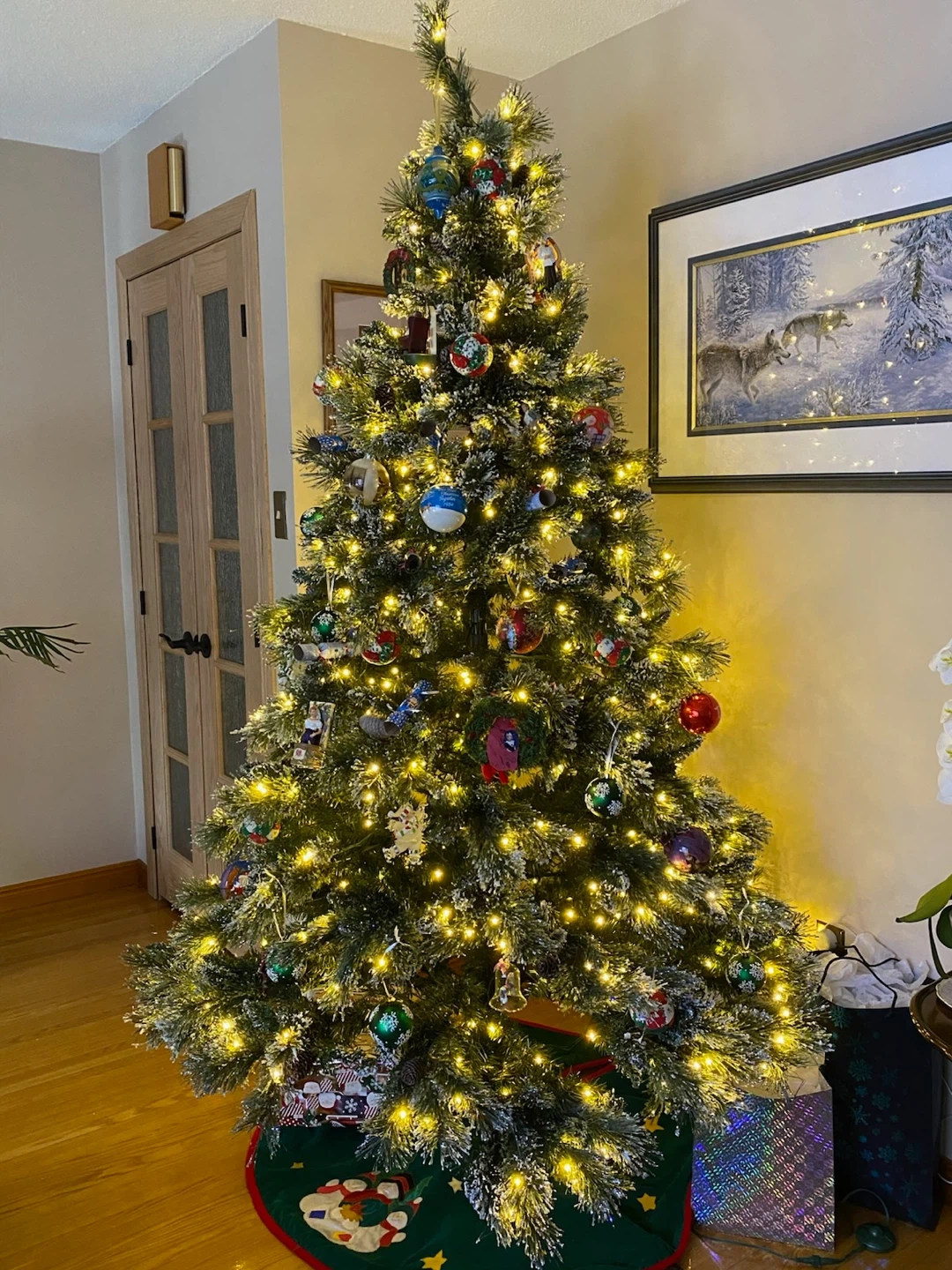 7foot Christmas tree with lights Comes together in 3 parts Used once ornaments not included Pickup and cash only