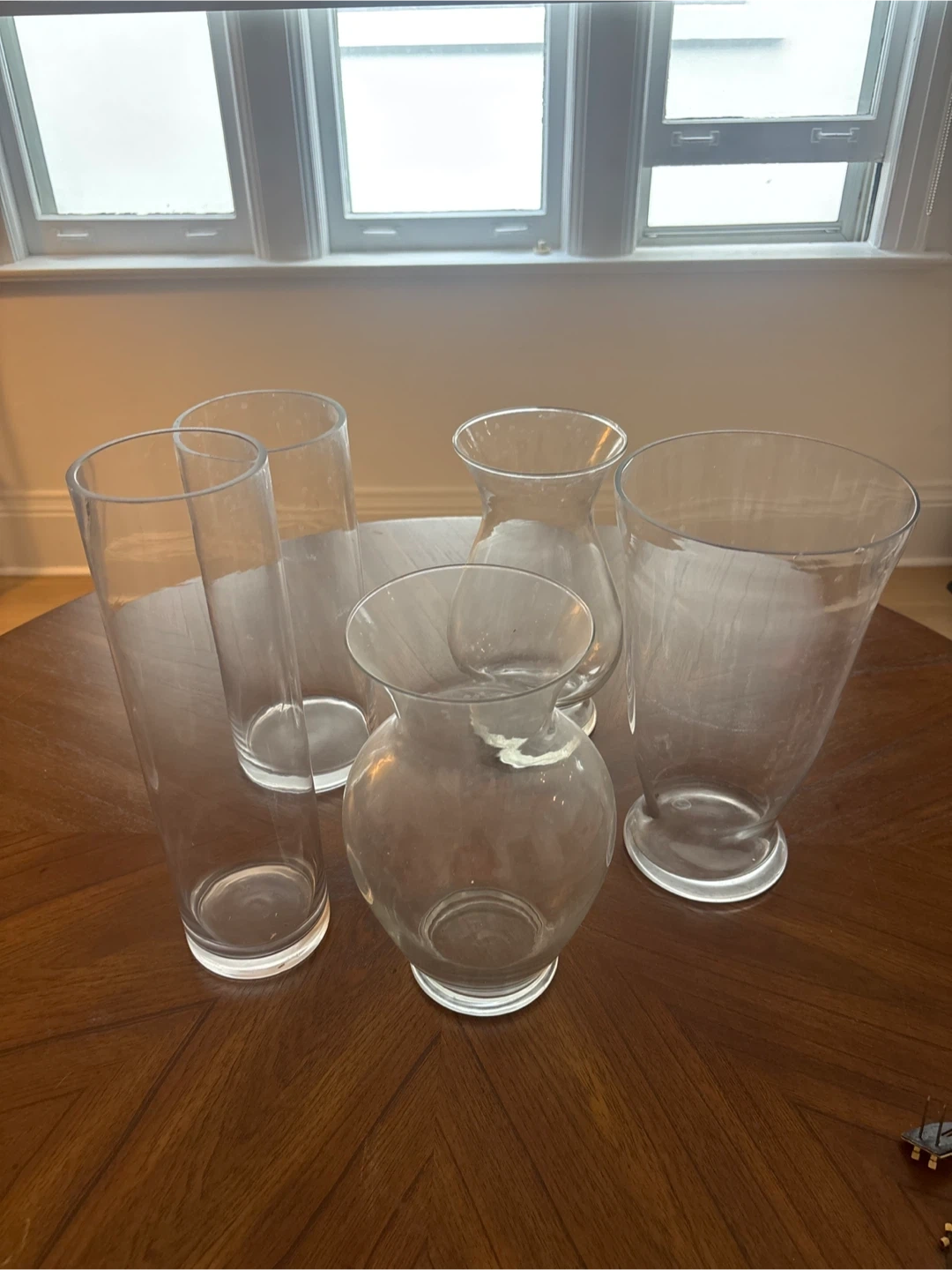 Selling a set of five clear glass vases in various shapes and sizes. They're perfect for displaying flowers or adding a touch of elegance to your home decor. $20 for all 5