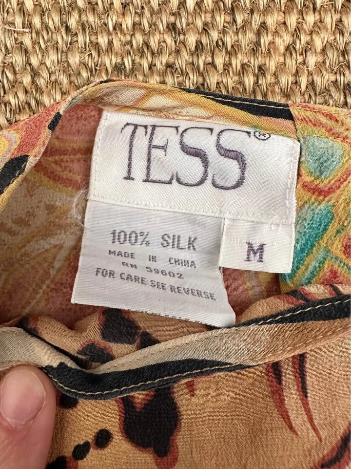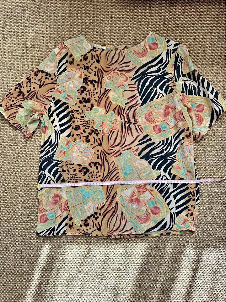 Size M vintage animal print 100% silk blouse, measurements in photos. Pick up outside Mont-Royal metro station. Cash only