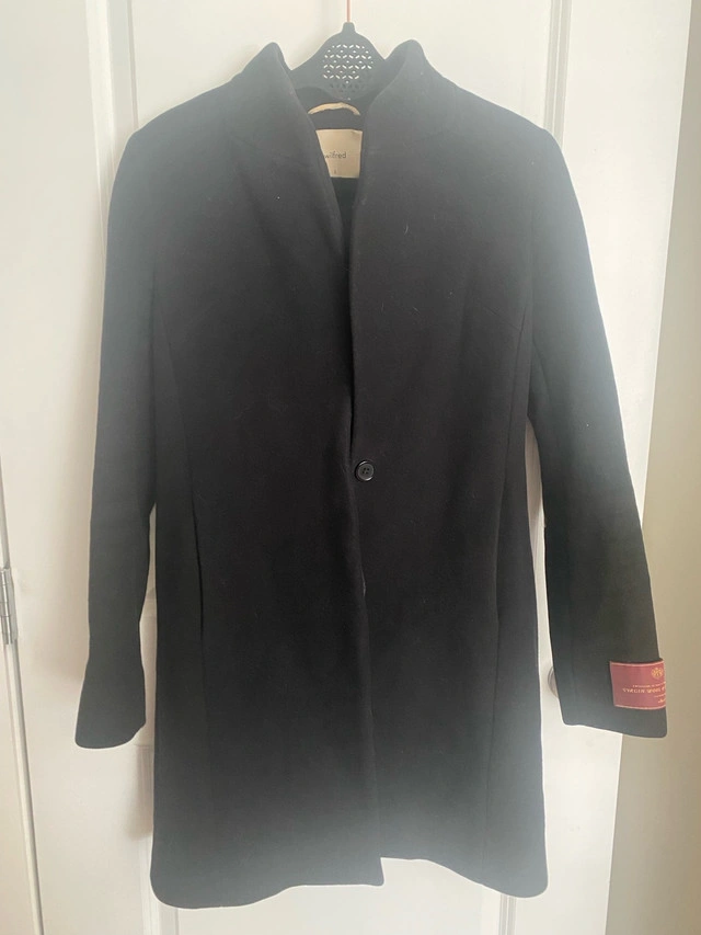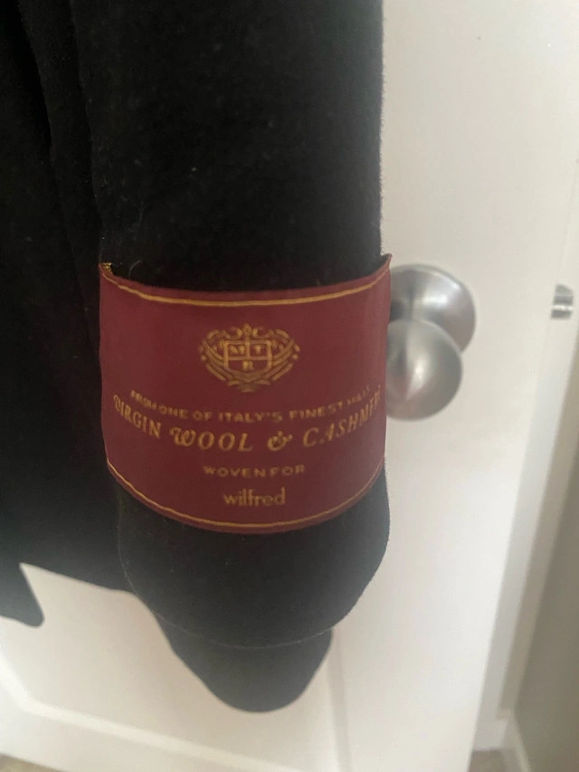 Wrap yourself in luxury with this Wilfred Free black wool and cashmere blend coat. This stylish coat features a sleek design and is made from high-quality materials for warmth and comfort. As it is a used item, it has been worn with care and is still in good condition, ready to elevate your wardrobe. Key Features: * Material: Virgin Wool and Cashmere Blend * Colour: Black * Brand: Wilfred Size Small Looking to add a touch of class to your closet without breaking the bank? This coat could be the one for you! If the ad is up, it's still available!