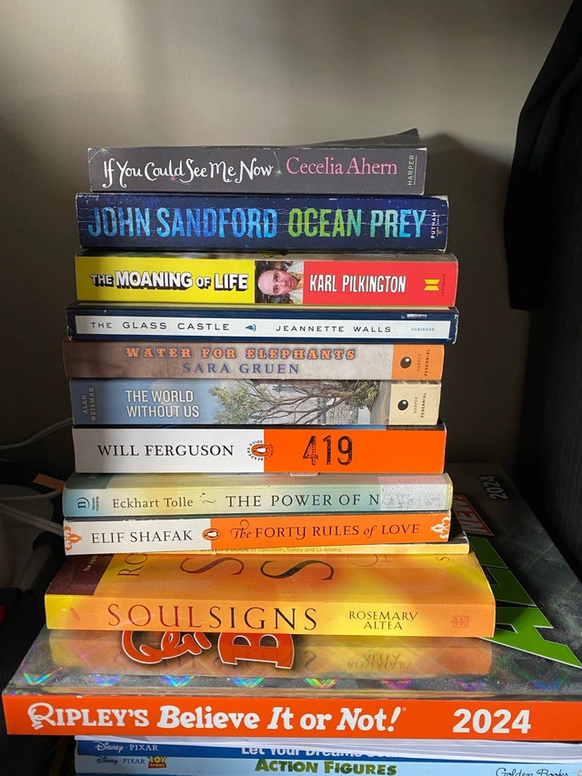 I'm offering a collection of used books that includes a variety of genres and authors, perfect for any reader looking to expand their library on a budget. Titles include "If You Could See Me Now" by Cecelia Ahern, "Ocean Prey" by John Sandford, "The Moaning of Life" by Karl Pilkington, "The Glass Castle" by Jeannette Walls, "Water for Elephants" by Sara Gruen, "The World Without Us" by Alan Weisman, "419" by Will Ferguson, "The Power of Now" by Eckhart Tolle, "The Forty Rules of Love" by Elif Shafak, "Soul Signs" by Rosemary Altea, and "Ripley's Believe It or Not!" 2024. They've been well-loved and are waiting for their next adventure. Remember, if the ad's still up, the books are still available!