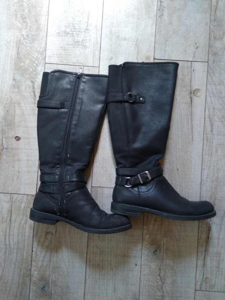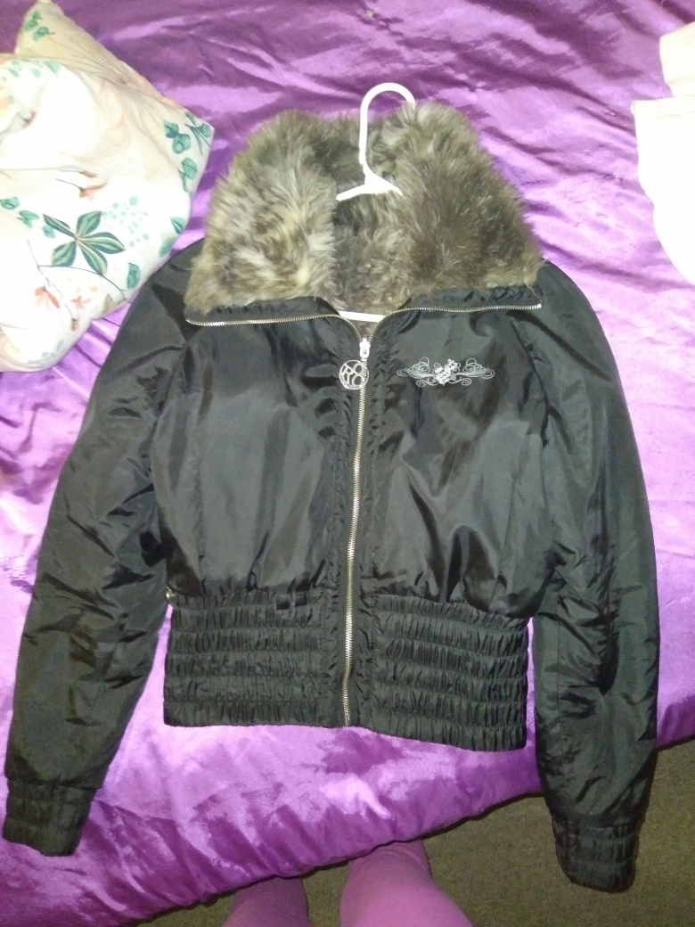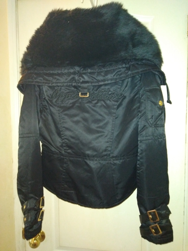 This is a black jacket with a fur collar. It has the Apple Bottoms logo on the back. The jacket is in good condition and ready for a new home! plus more.. reasonable offer only...