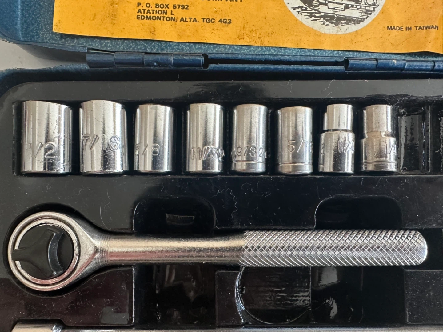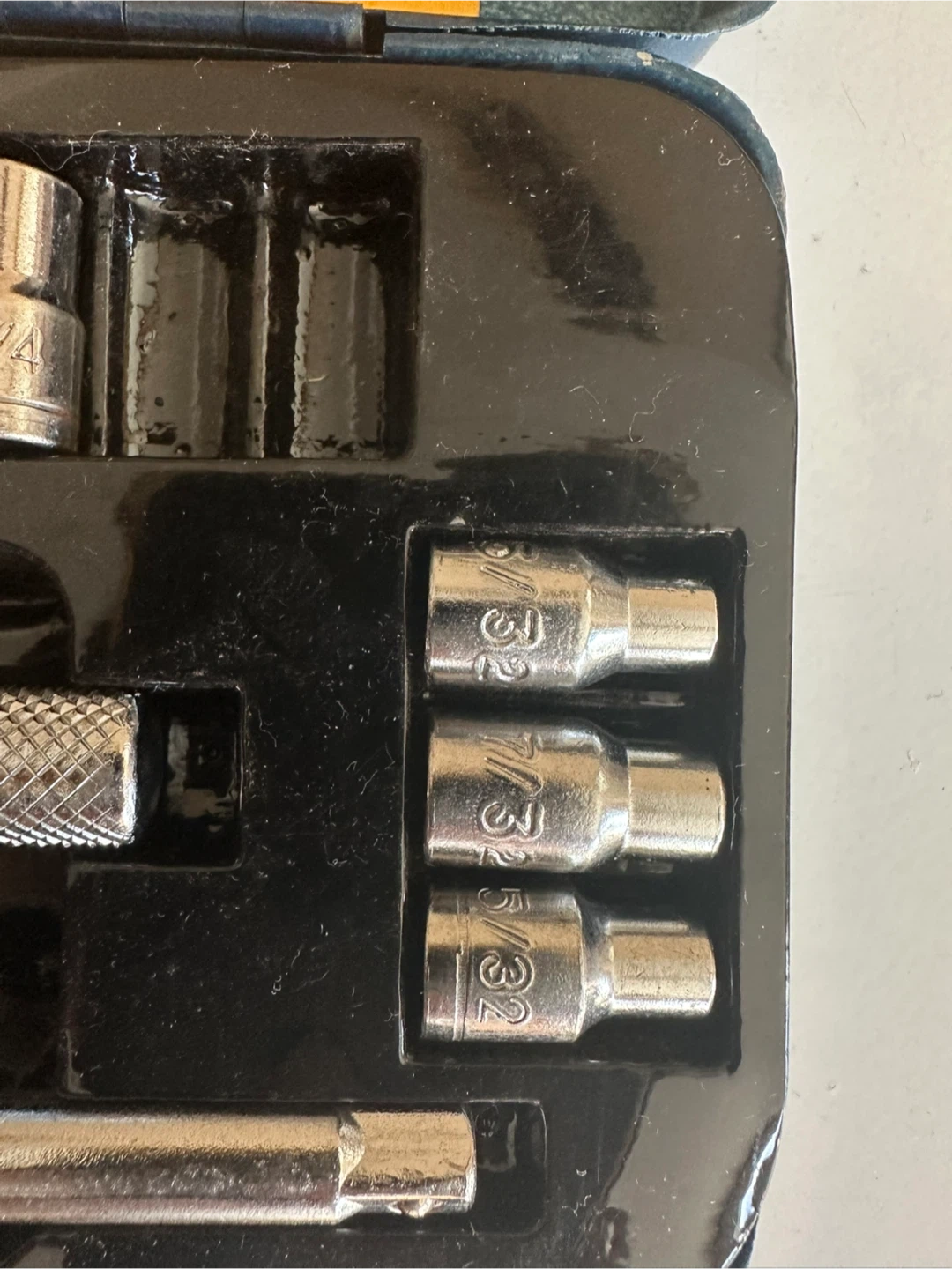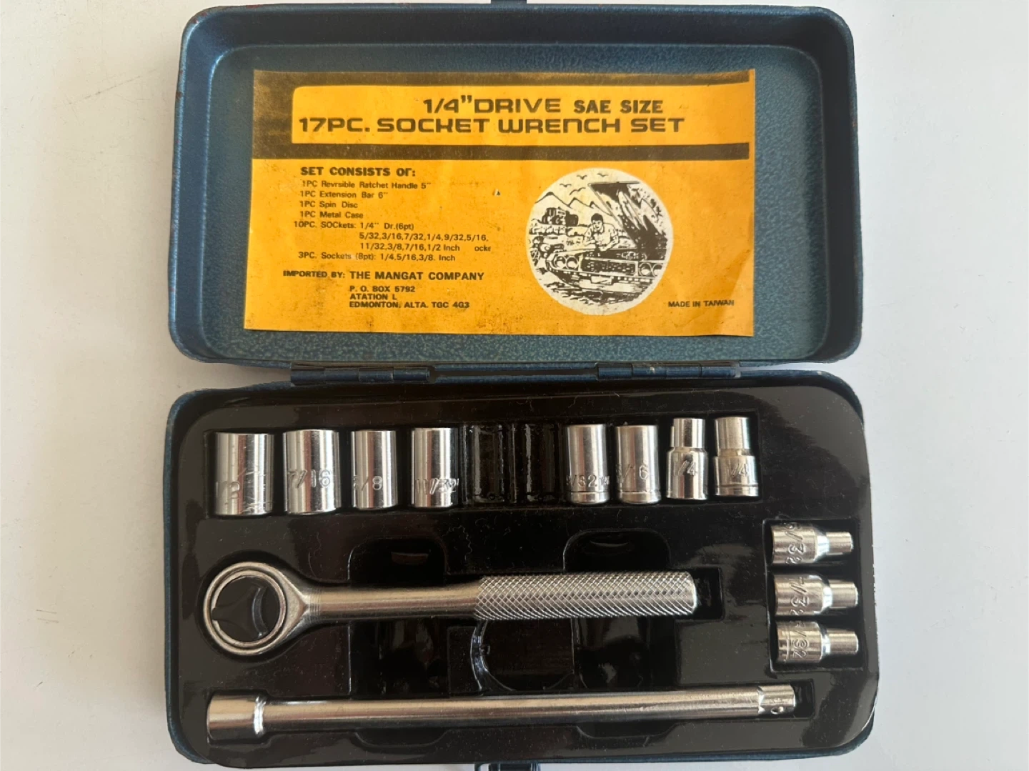 Selling a 17-piece socket wrench set. Comes in a metal case and includes a reversible ratchet handle, extension bar, and various sockets. Check out the photos for all the details! Note: 2 sockets are missing. Price is adjusted accordingly Otherwise the set is in great working condition