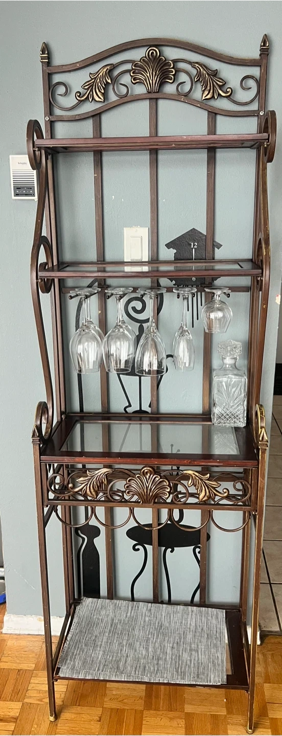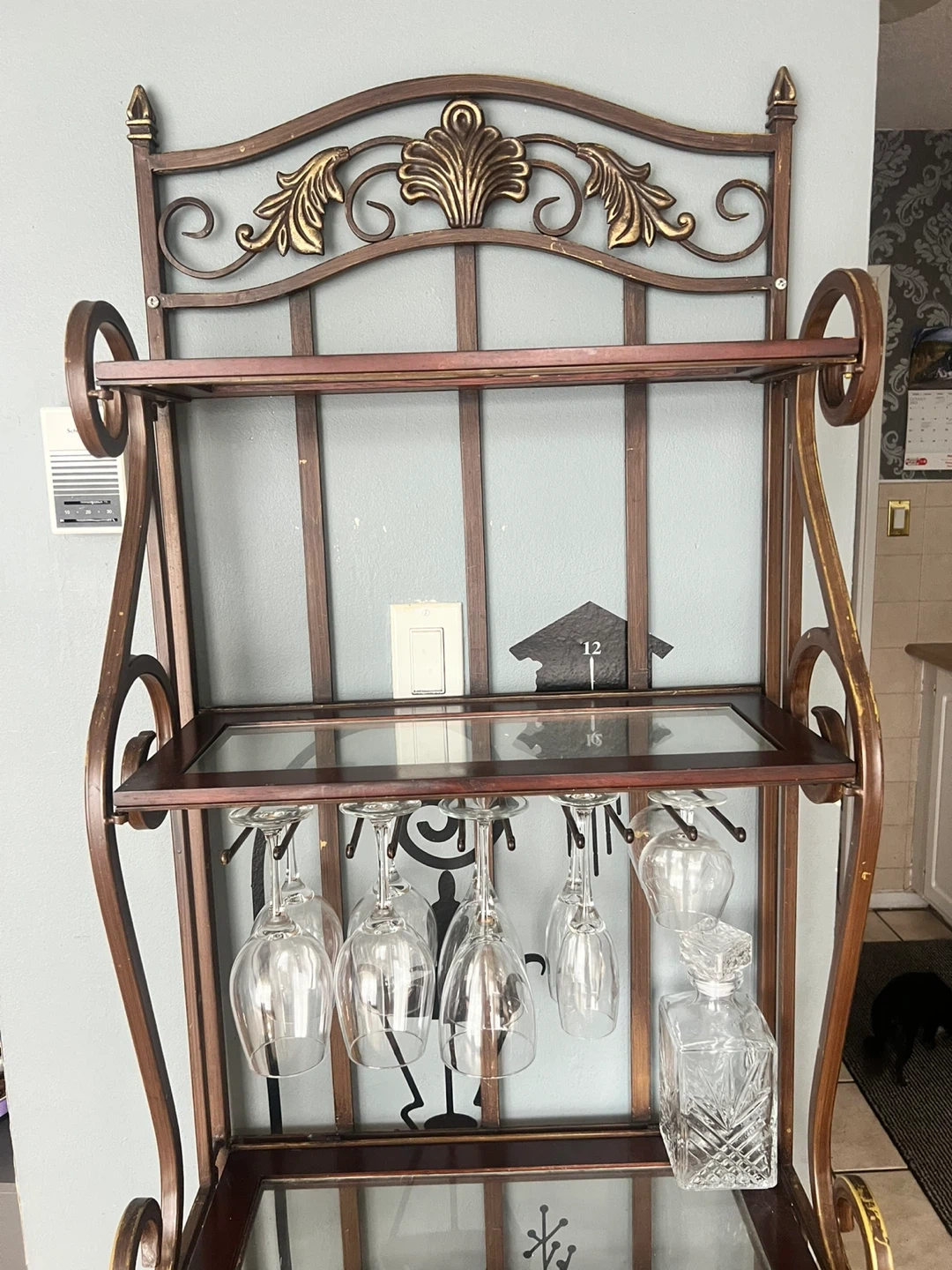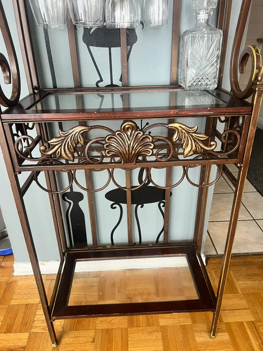Selling a beautiful bar cart with a metal frame and glass shelves. It's perfect for displaying your favourite drinks and glassware. The ornate detailing adds a touch of elegance to any room. This cart is in great condition and ready to elevate your home decor!