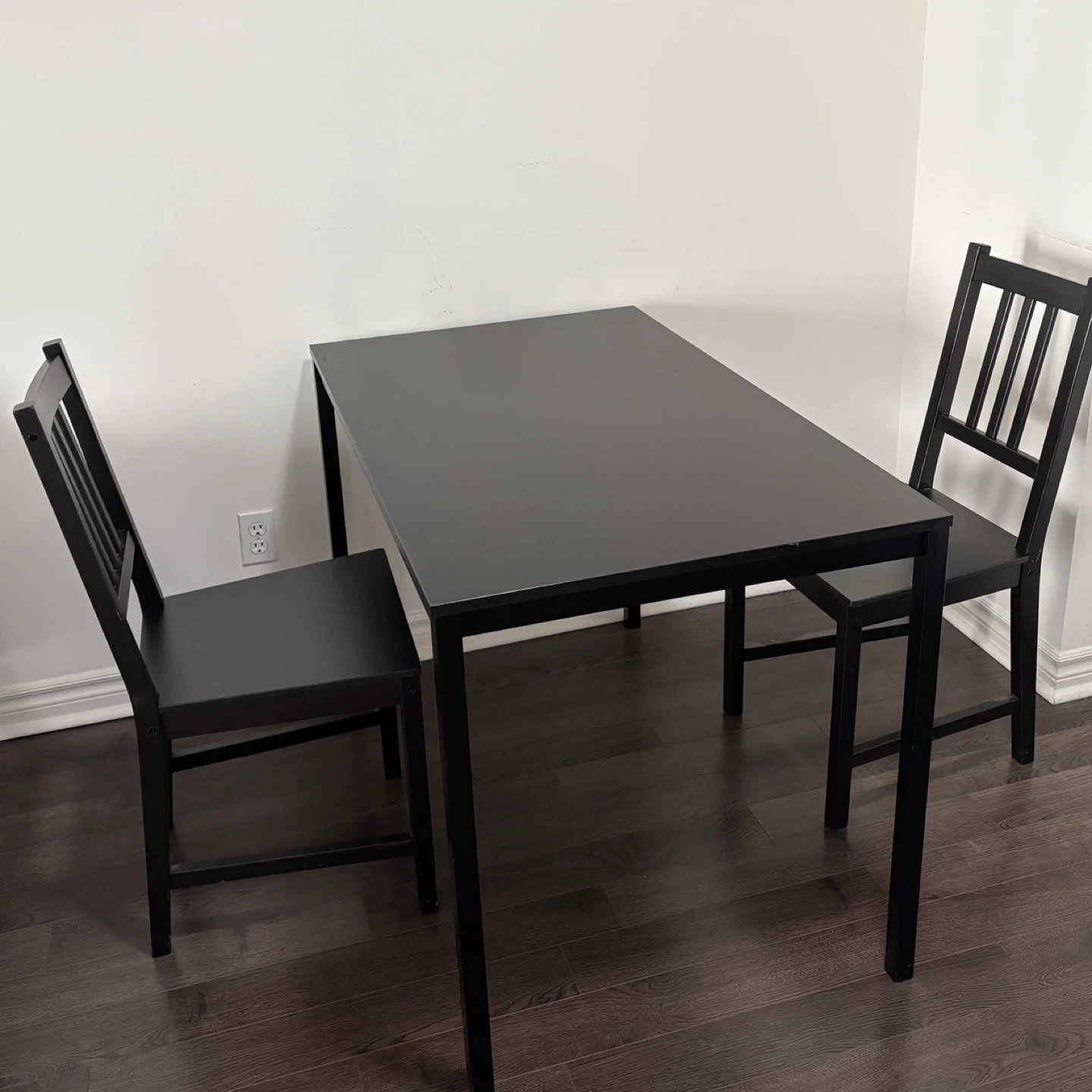 Selling a simple black dining table with two matching chairs from IKEA. The length of table is 1100mm. Perfect fit for 2ppl or if you get more chairs, 4ppl can be seated. No scratches noticeable, No wobbles Pick up at a condo near North York Centre Station