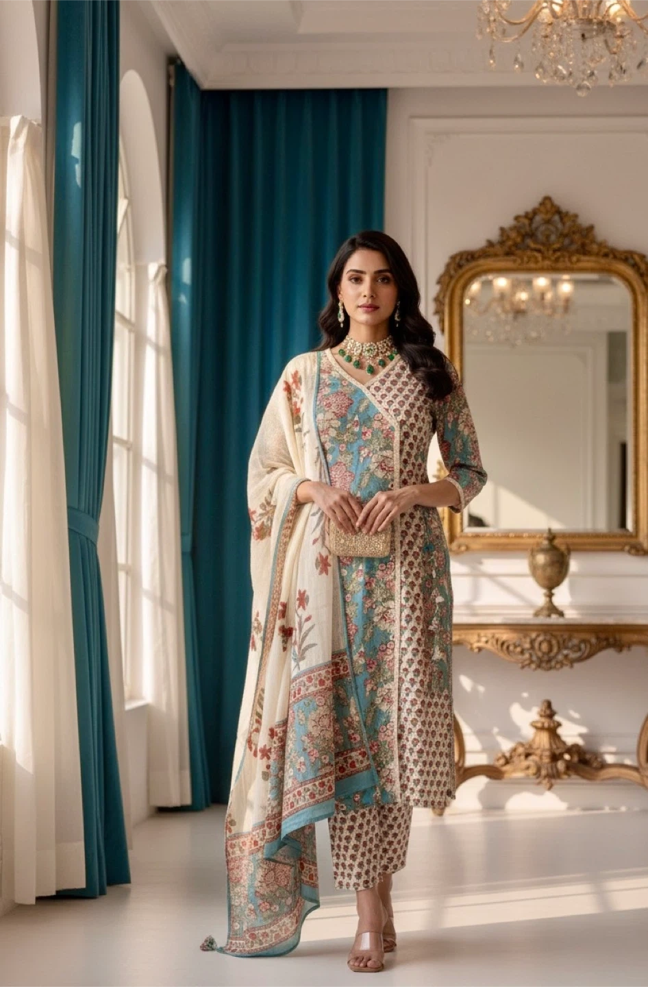 This is a beautiful floral print kurta set with a dupatta. The kurta features a unique wrap-style neckline and a mix of floral and geometric prints. The pants are also printed and the set includes a matching dupatta. It's in great condition and perfect for a special occasion or everyday wear!