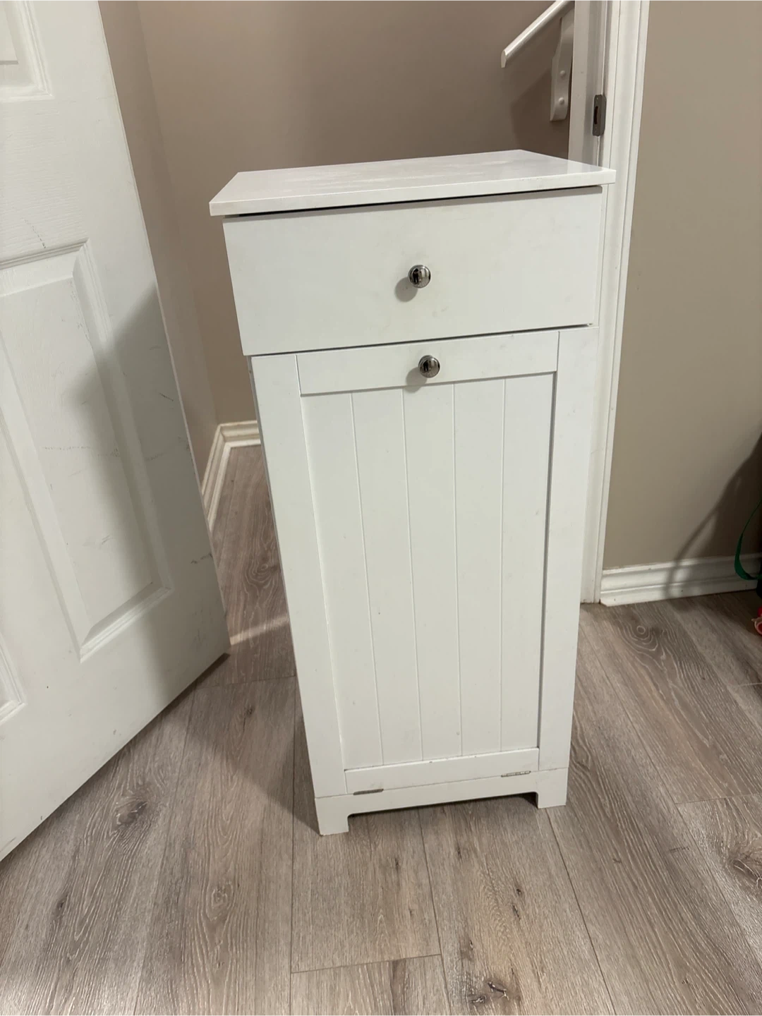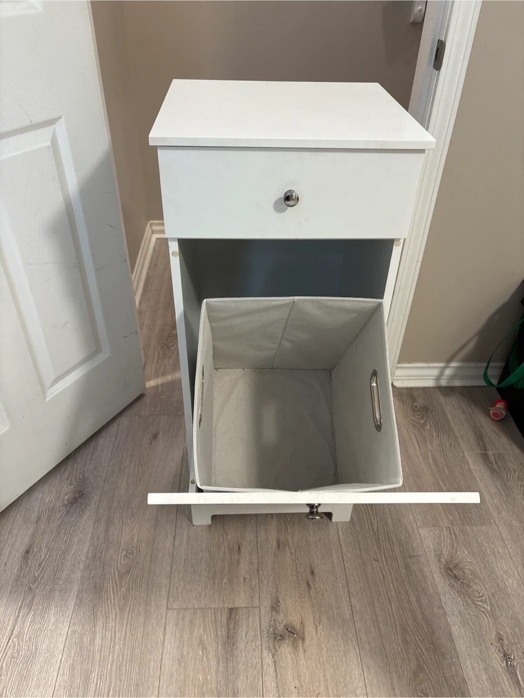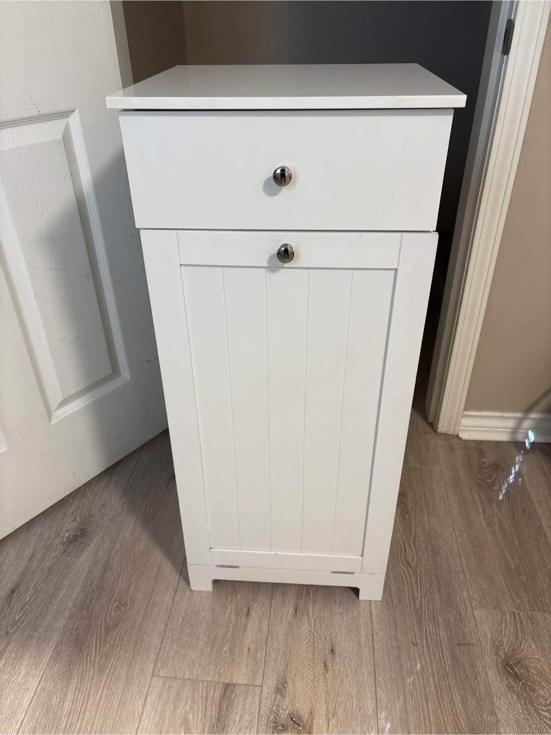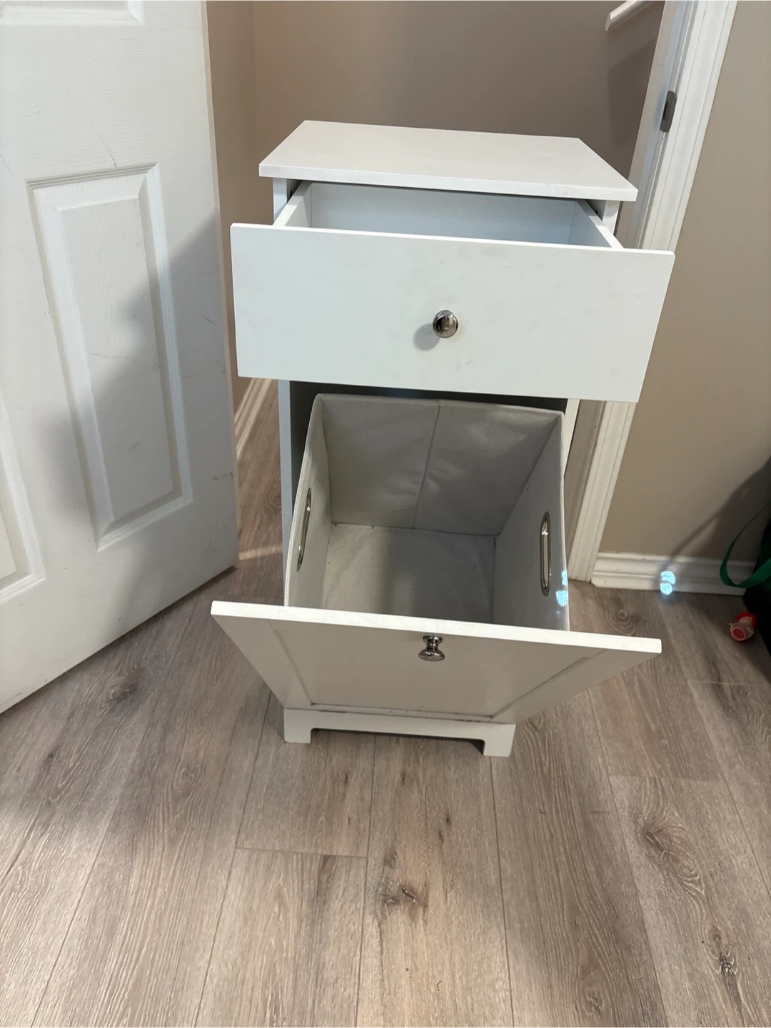 Selling a handy white bathroom cabinet! It features a drawer up top, plus a tilt-out hamper below. Perfect for keeping things tidy in a small space , very strong material pick up walnut grove Langley .