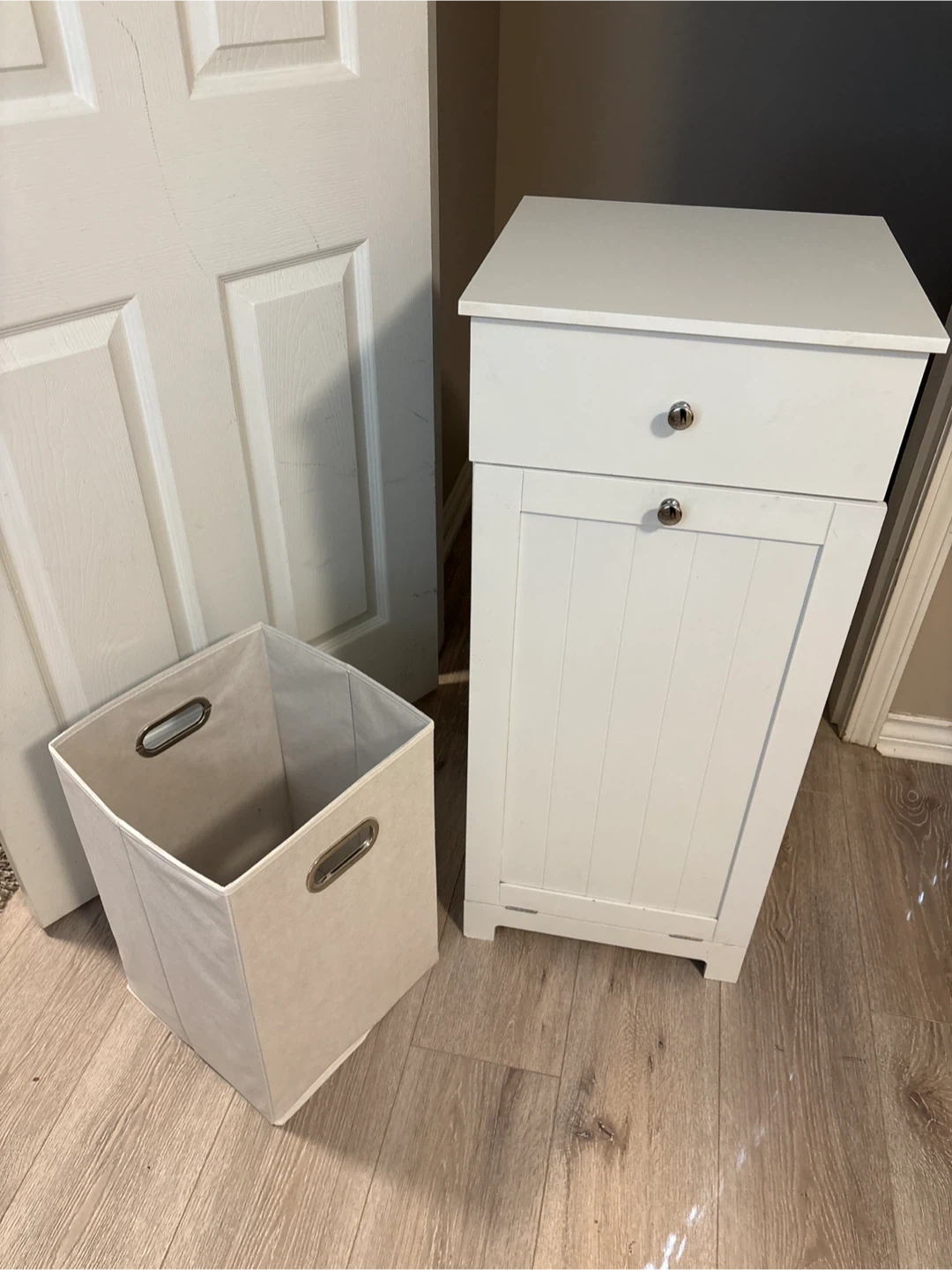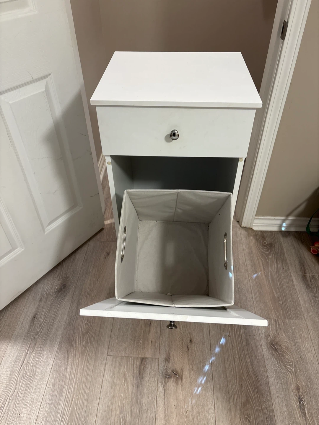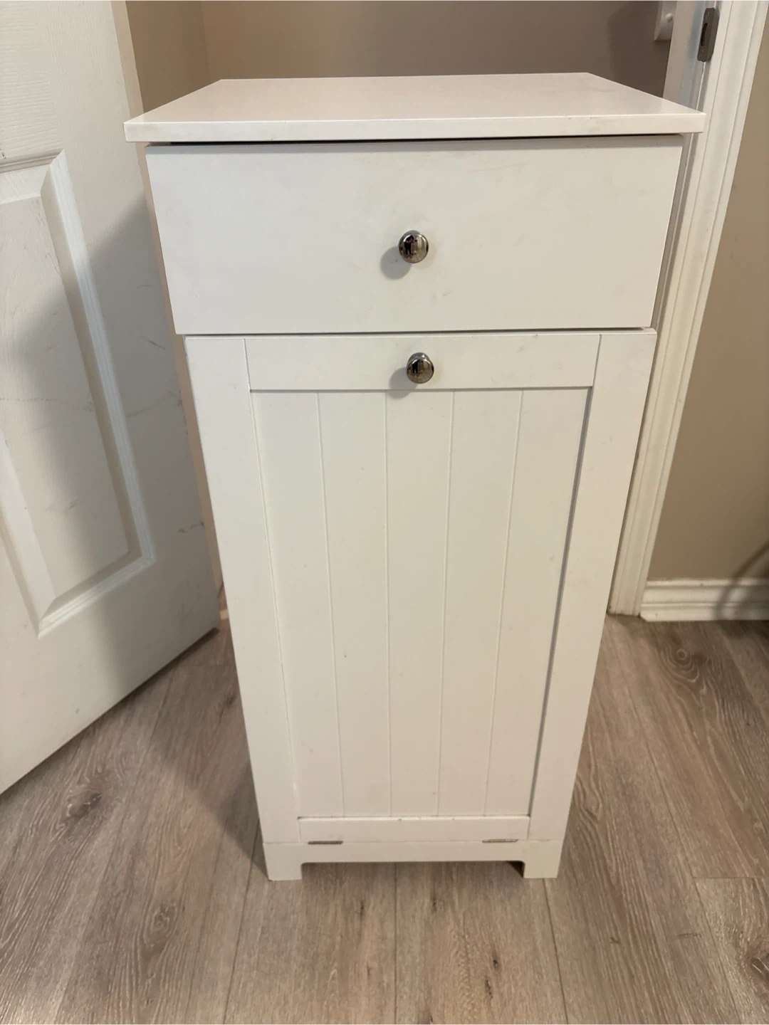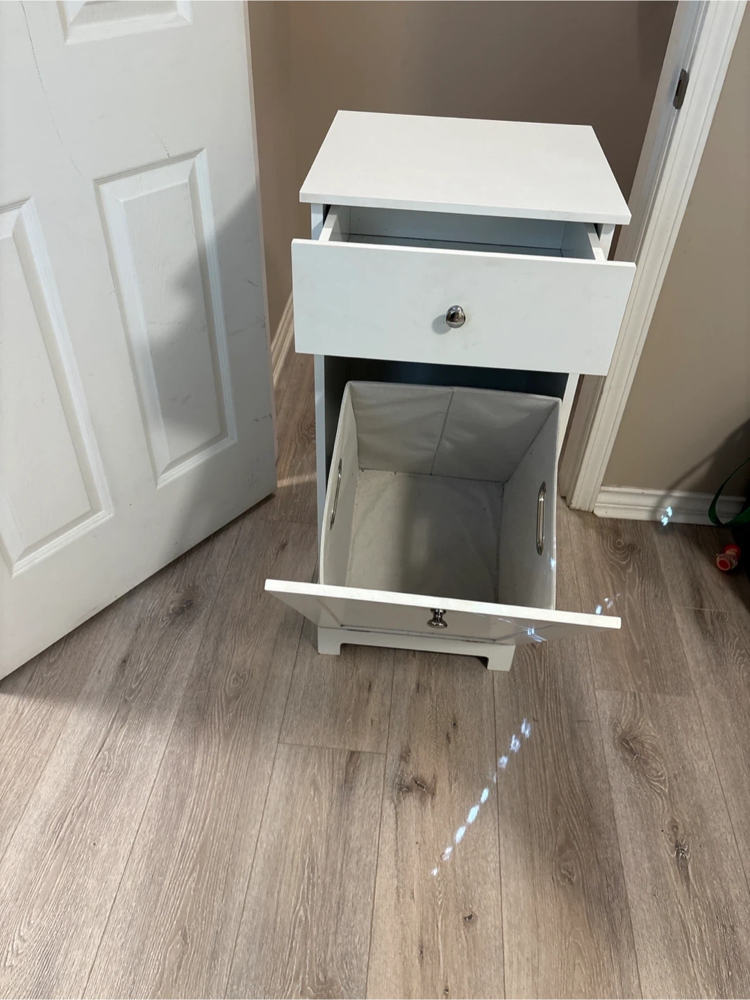 Selling a handy white bathroom cabinet! It features a drawer up top, plus a tilt-out hamper below. Perfect for keeping things tidy in a small space , very strong material pick up walnut grove Langley .