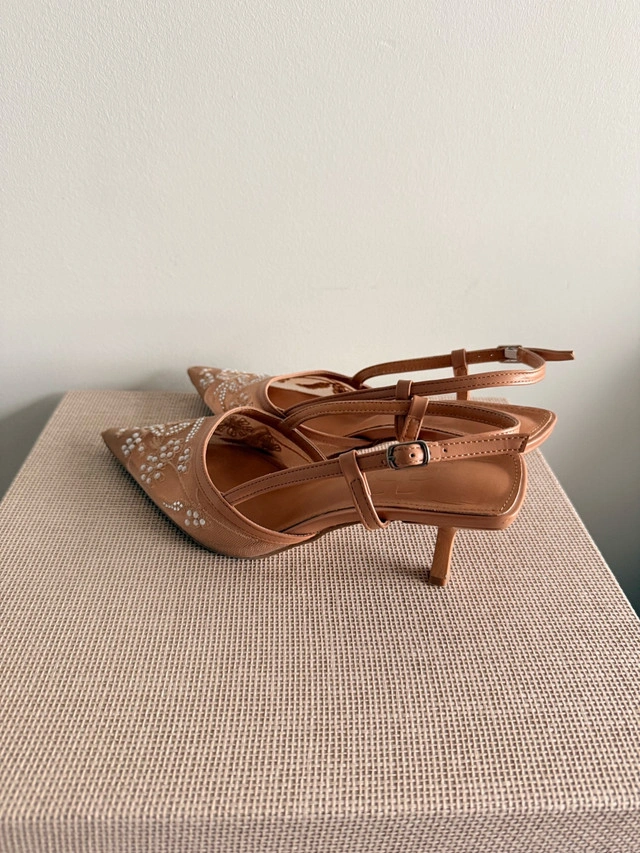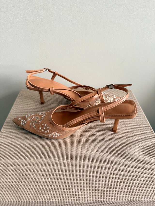 Beige slingback shoes with mesh and pearl studded embellishments Size 38 (7.5) Condition: Used - Good Size: 7.5 Cash accepted: Yes Cashless payment: Yes For Sale By: Owner