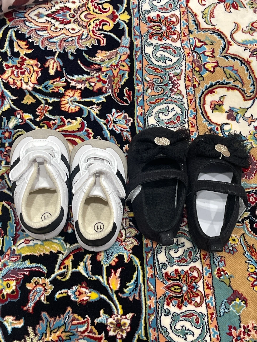 Two pairs of baby shoes available! One pair is white with black stripes, and the other is black with a cute bow detail. Both are size 11.