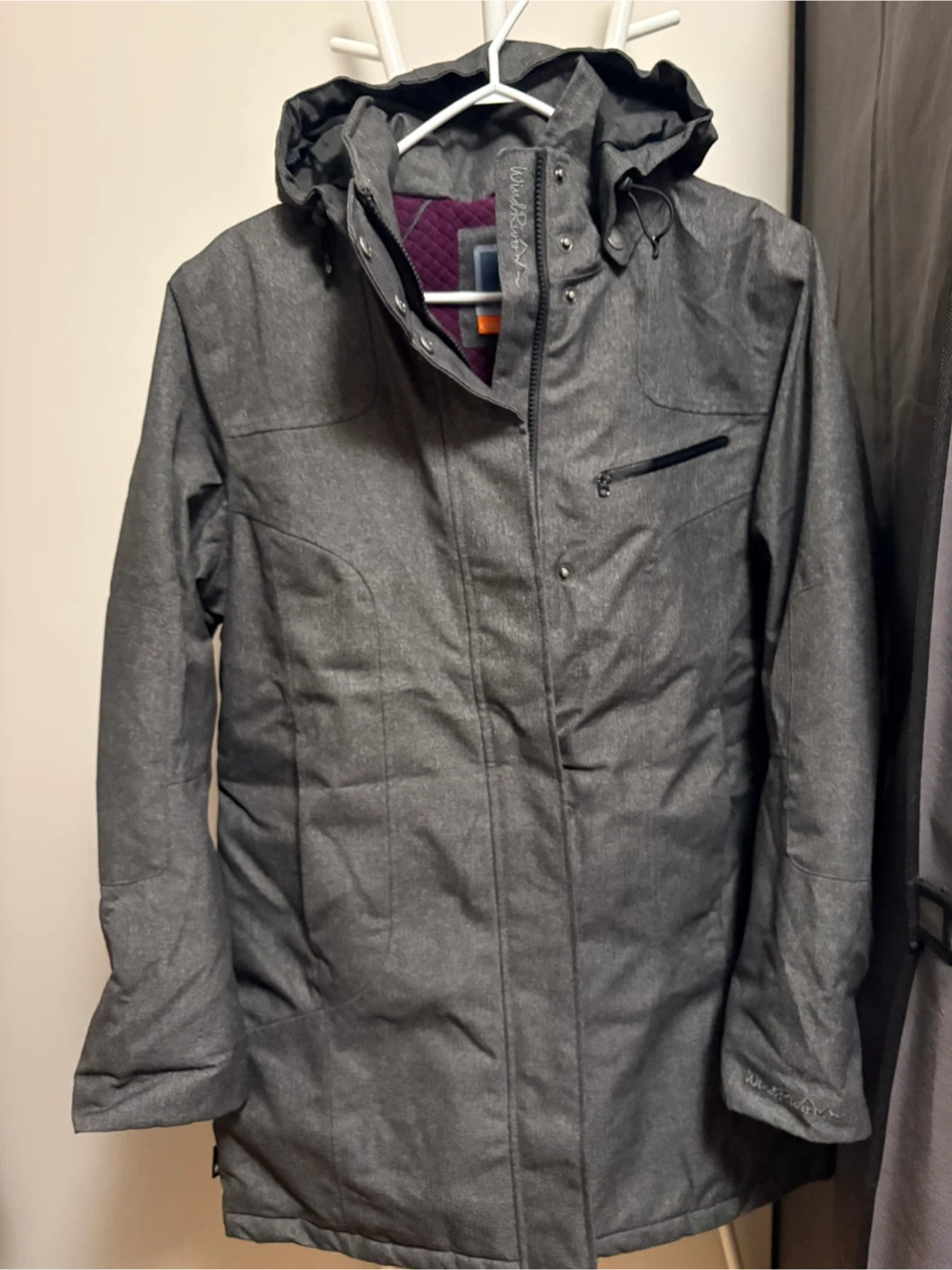 Selling a Wind River jacket in size large. It's a stylish gray colour and in great condition. The hood can be buttoned off. Perfect for staying warm and dry!