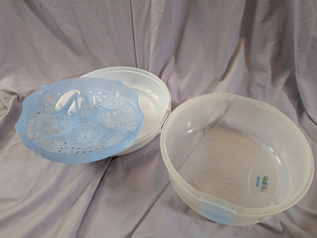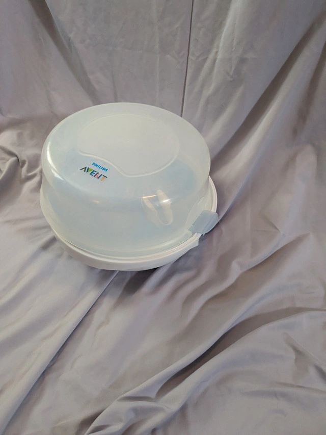 Retail $40. Asking $10 OBO. Almost original condition, but used. Smoke-free, pet-free home. Uses natural steam to kill 99.9% of germs and bacteria without chemicals. Sterilizes baby bottles and other baby products in just 2 minutes and fits in most microwave ovens. Holds up to 4 Philips Avent bottles at once; compatible with both standard and wide neck bottles. That's why we bought it.