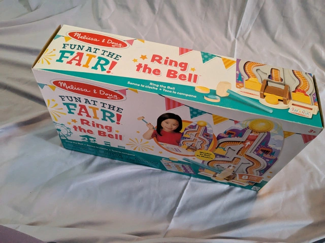 Retail $42. Asking only $15 OBO. New in box. Step right up and turn any day into Fair Day! The Melissa & Doug Fun at the Fair!™ Ring the Bell is a wooden tabletop version of a classic fair game that lets kids use both strength and finesse to launch three wooden jewels along tracks and into the mine carts. FEATURES Use strength and skill to launch wooden jewel disks through tracks on the wooden treasure mountain and into mine carts filled with matching-colored jewels Includes easy-to-assemble (one-time permanent assembly) wooden mountain panel with flip-out cart doors, wooden mallet, 3 wooden jewels, reusable color-matching game scorecard, red lens reveal player card Different amounts of force send jewels along different tracks (hardest hit rings the bell); a fun introduction to cause-and-effect and great for learning colors, matching, counting, and encourages problem-solving and motor skills From games of skill and chance to innovative carnival-inspired play sets, the Melissa & Doug Fun at the Fair!™ collection brings home all the fun of a day at the fair Makes a great gift for preschoolers, ages 3 to 5, for hands-on, screen-free play Includes wooden mountain panel, base, wooden mallet, 3 wooden jewels, scorecard, player card WHAT'S INCLUDED Wooden mountain panel, base, wooden mallet, 3 wooden jewels, scorecard, player card DETAILS Age: 3 years & up Condition: New For Sale By: Owner