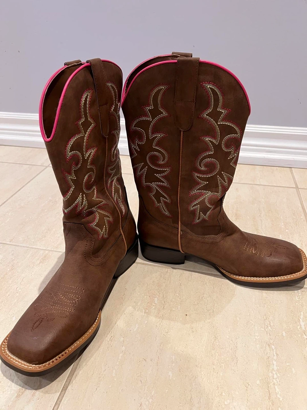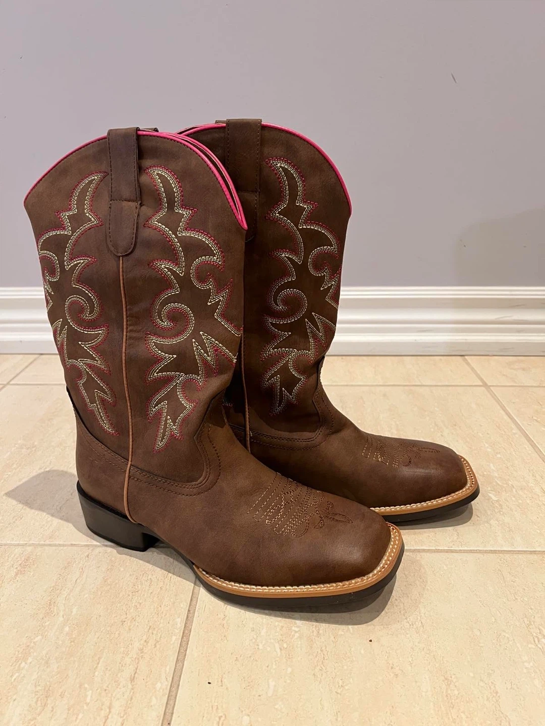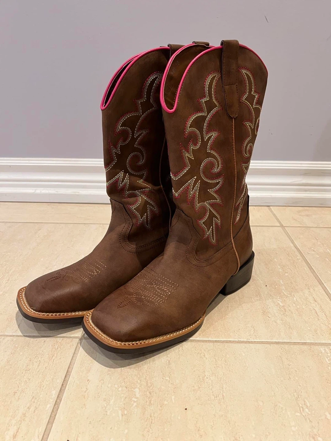 Selling a pair of brown cowboy boots with a cute pink trim! They have a square toe and decorative stitching. Great for line dancing or everyday wear!