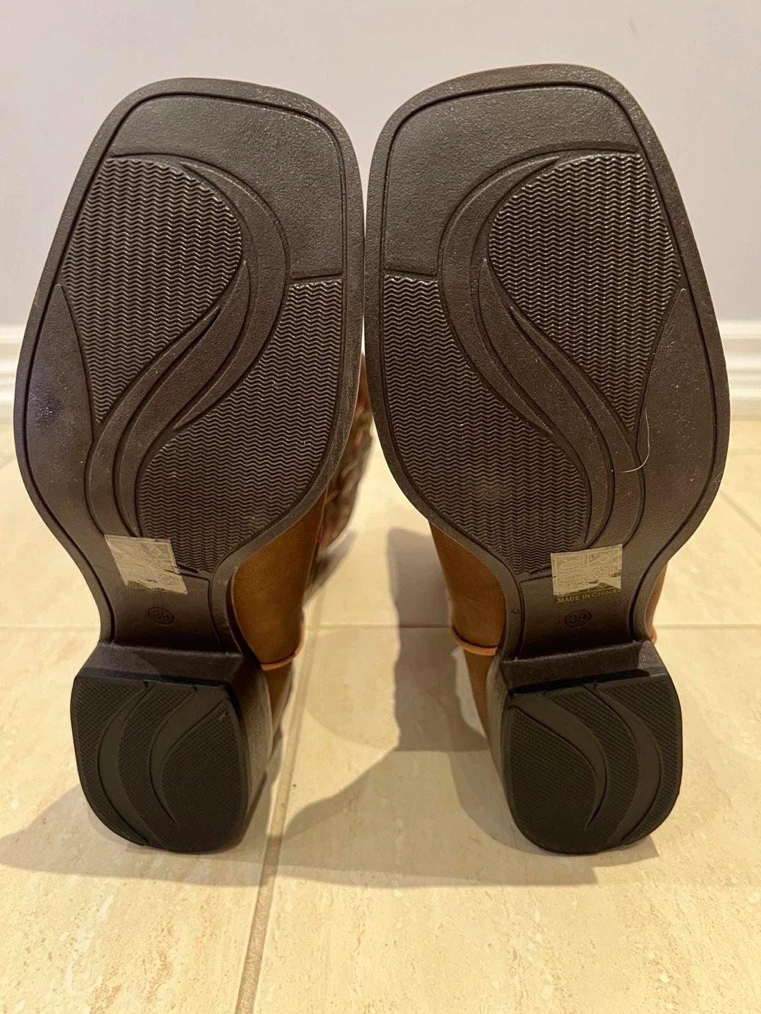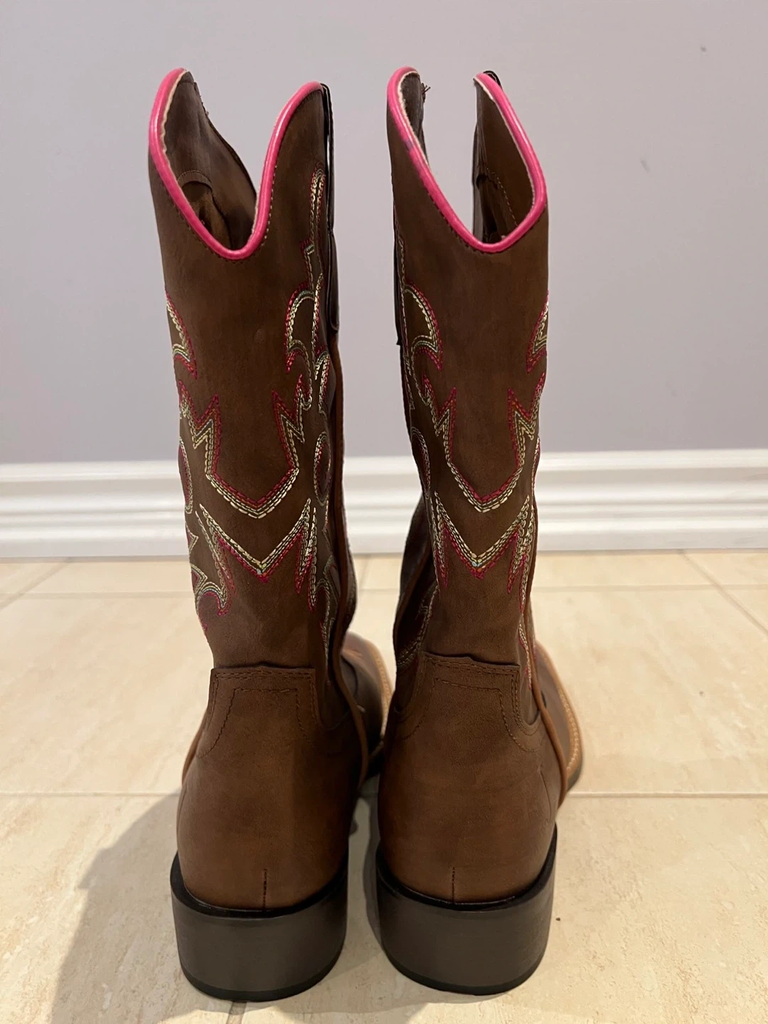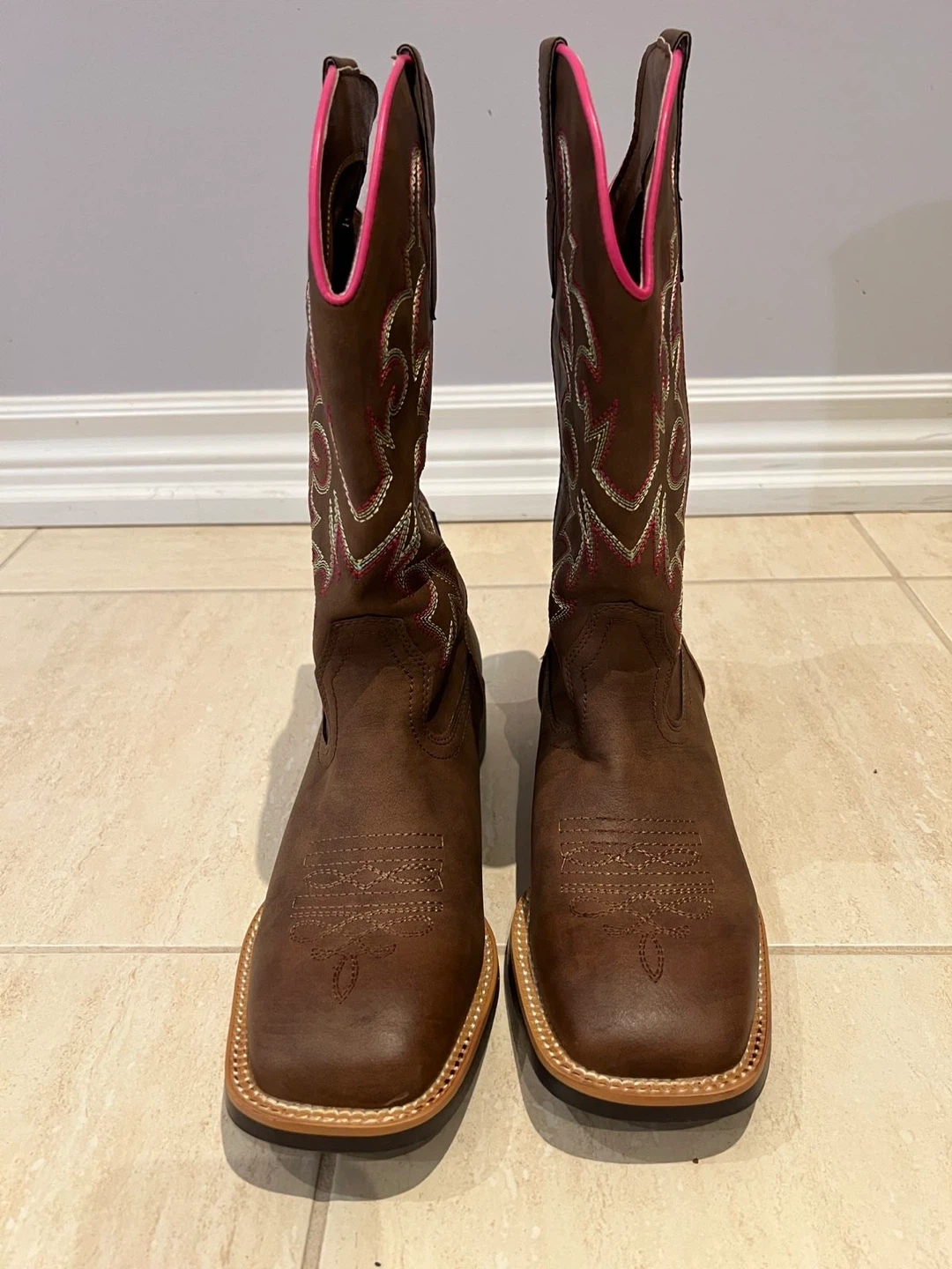 Selling a pair of brown cowboy boots with a cute pink trim! They have a square toe and decorative stitching. Great for line dancing or everyday wear!