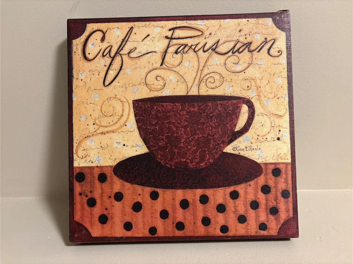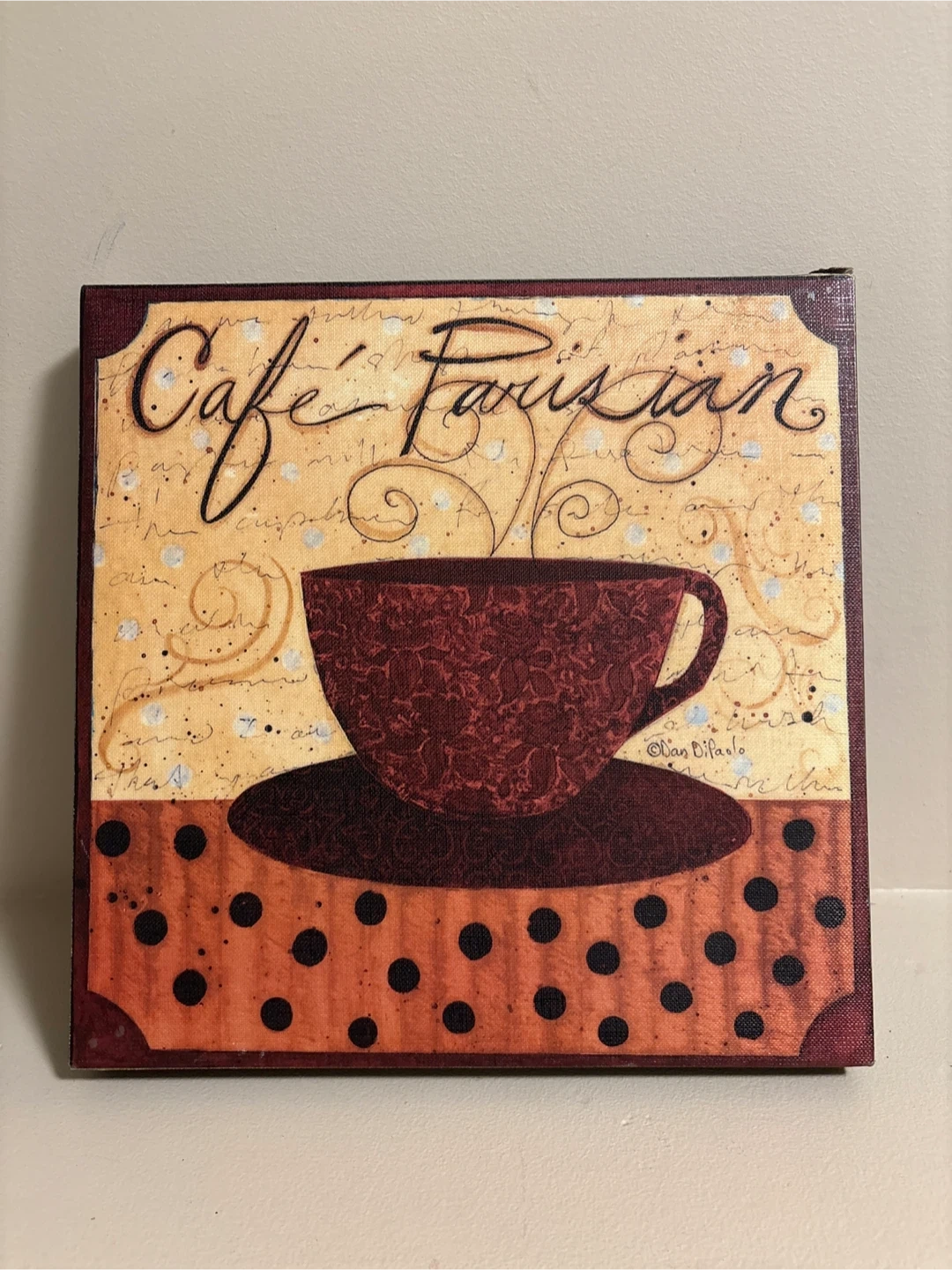 Here's a charming piece of wall art featuring a 'Cafe Parisian' design! It has a lovely coffee cup motif and would be a great addition to any kitchen or dining area