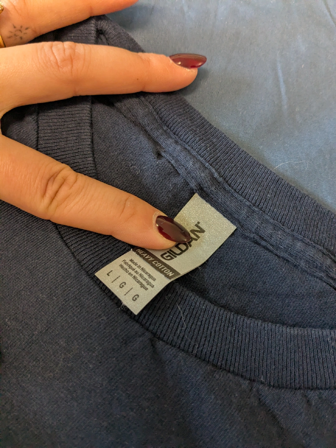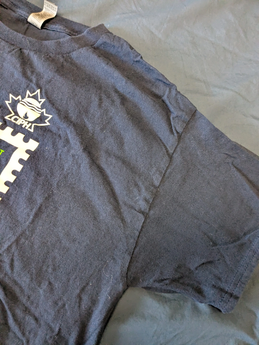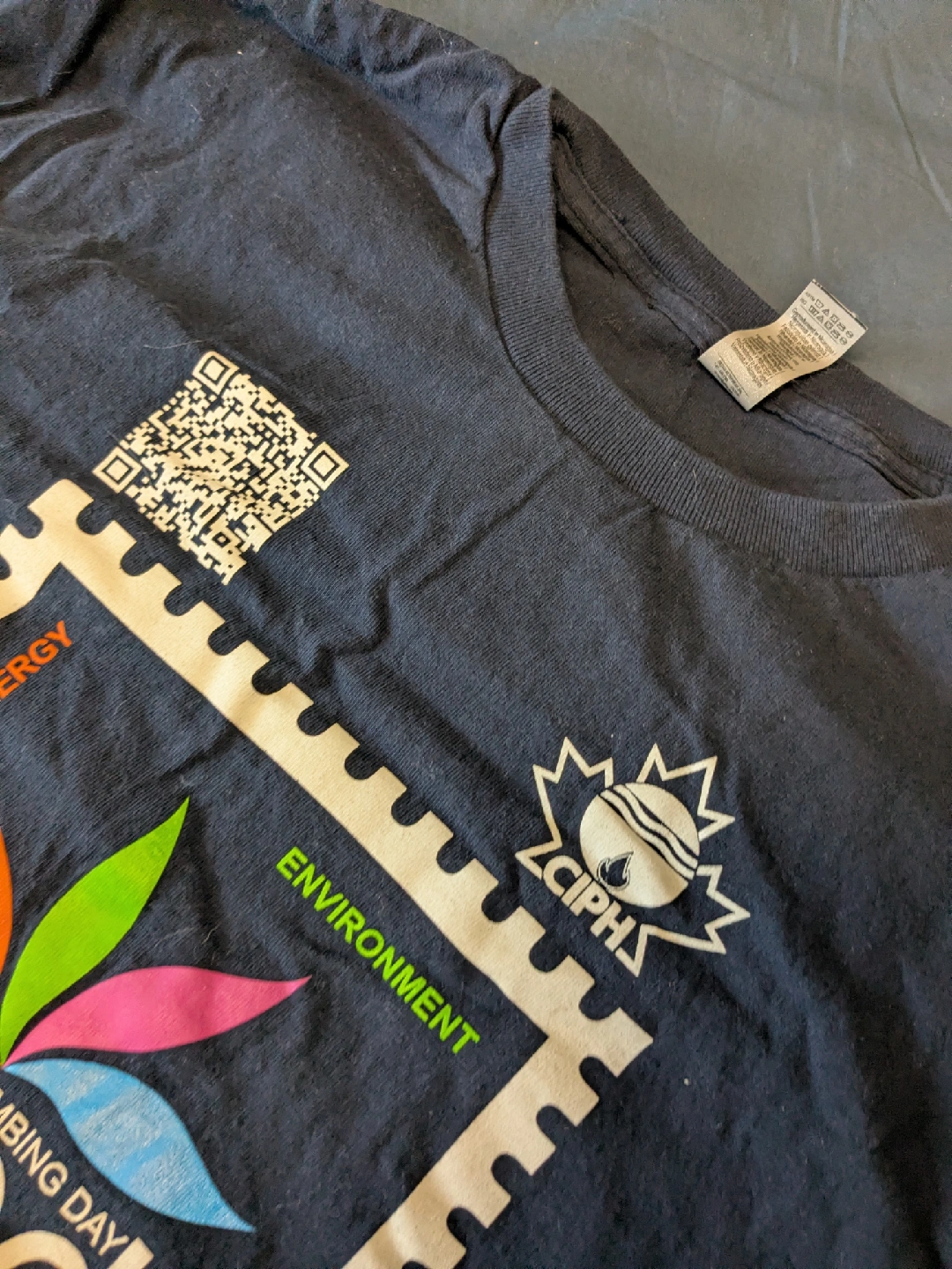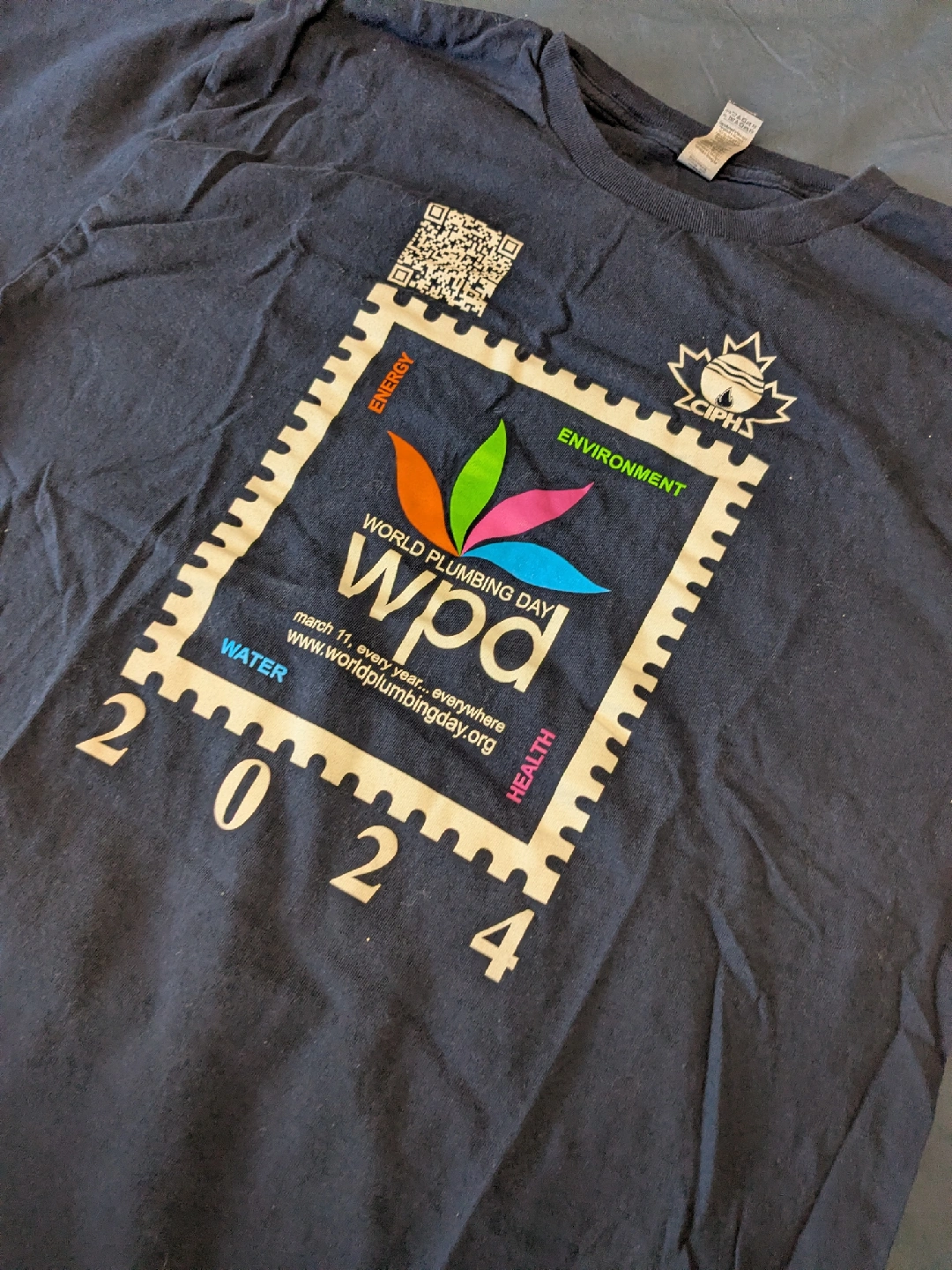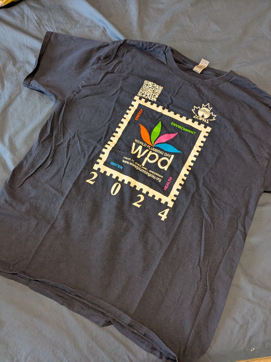 Selling a Gildan T-shirt in size L. It's dark blue and features a design for World Plumbing Day 2024, with a colourful graphic and the CIPH logo. It's in good condition and ready for a new home!