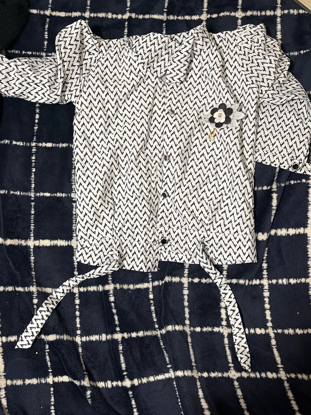 This kids' outfit features a stylish patterned top and wide-leg pants, perfect for a fashionable young one. The set appears to be in good condition, ready for its next adventure. * Stylish Pattern * Wide-Leg Pants Condition: Used - Good Size: Size 10 Girls Clothes