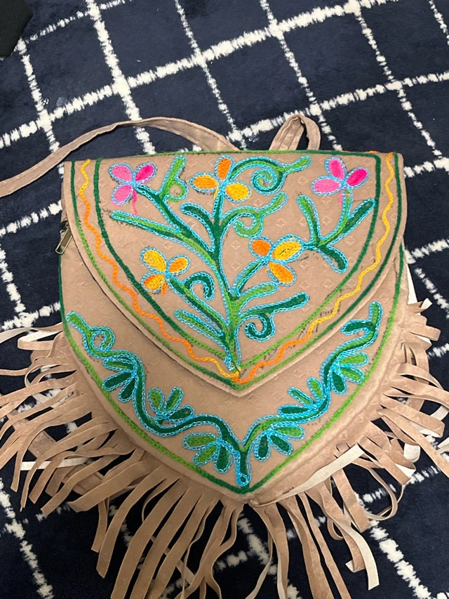 This is a pre-owned Kashmir-style crossbody bag featuring tan faux suede with colourful floral embroidery and playful fringe. A unique accessory to brighten any outfit! Key Features: - Material: Faux suede with embroidery - Style: Crossbody - Design: Floral with fringe detailing - Colour: Tan with multicoloured embroidery Condition: Used - Good Cash accepted: Yes