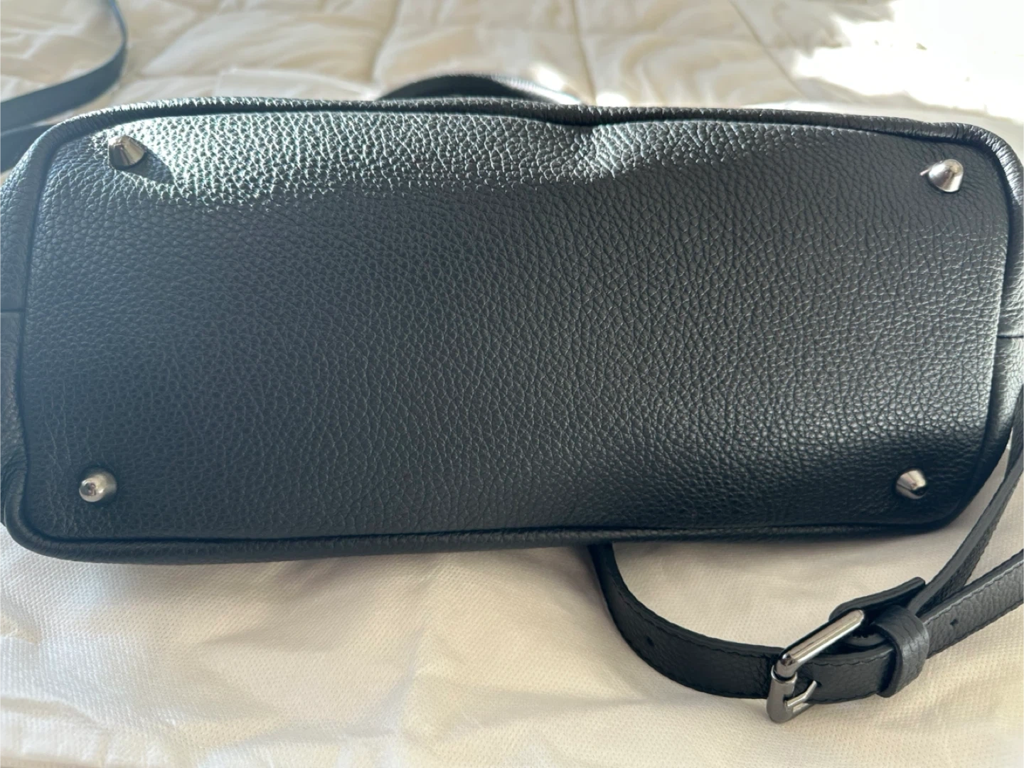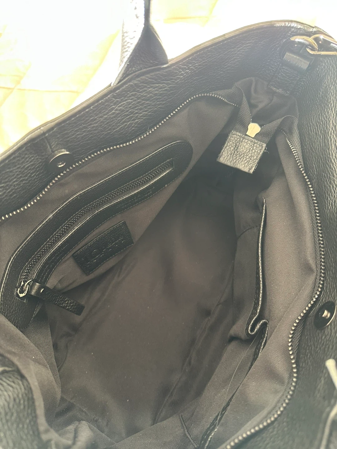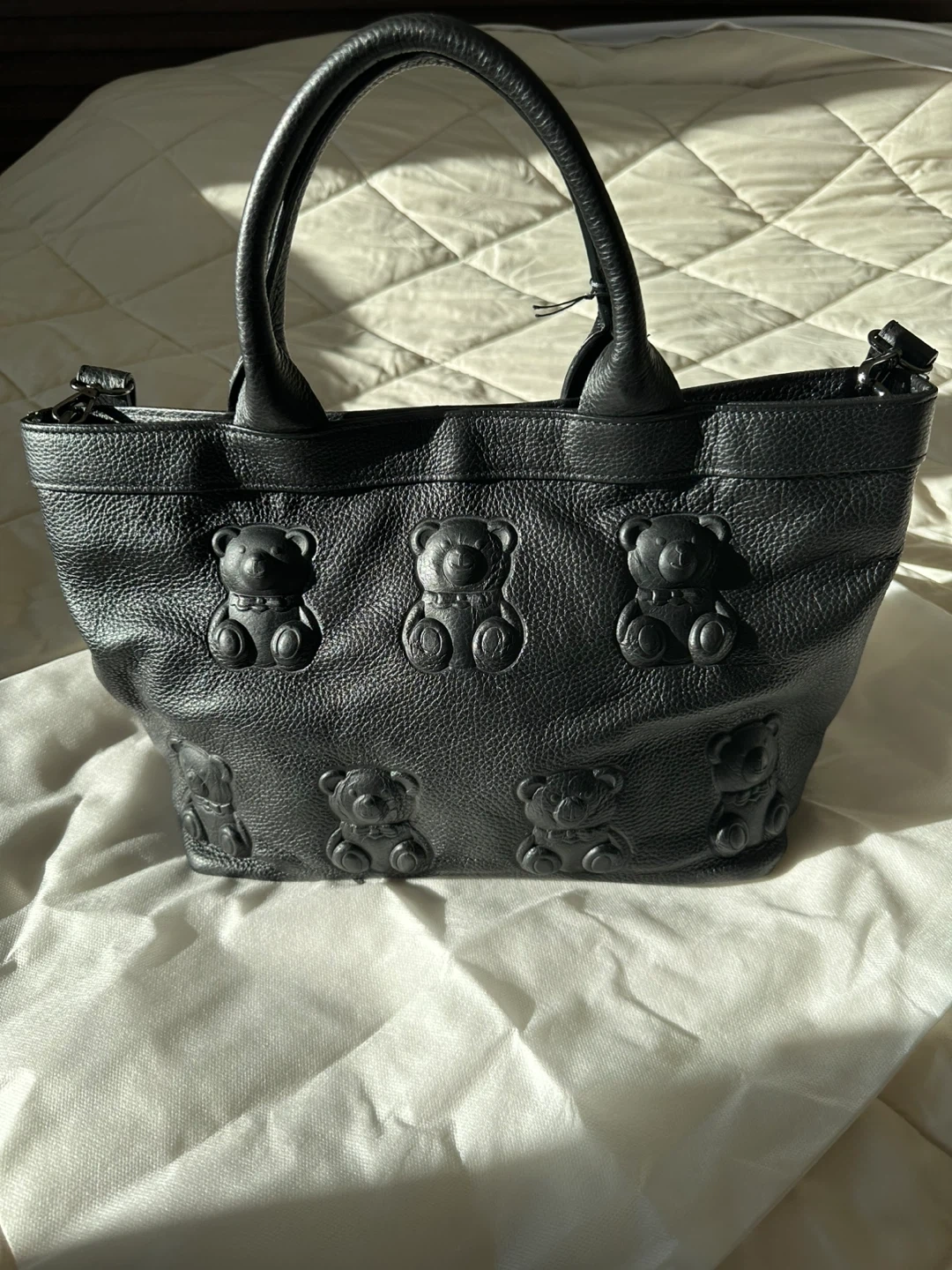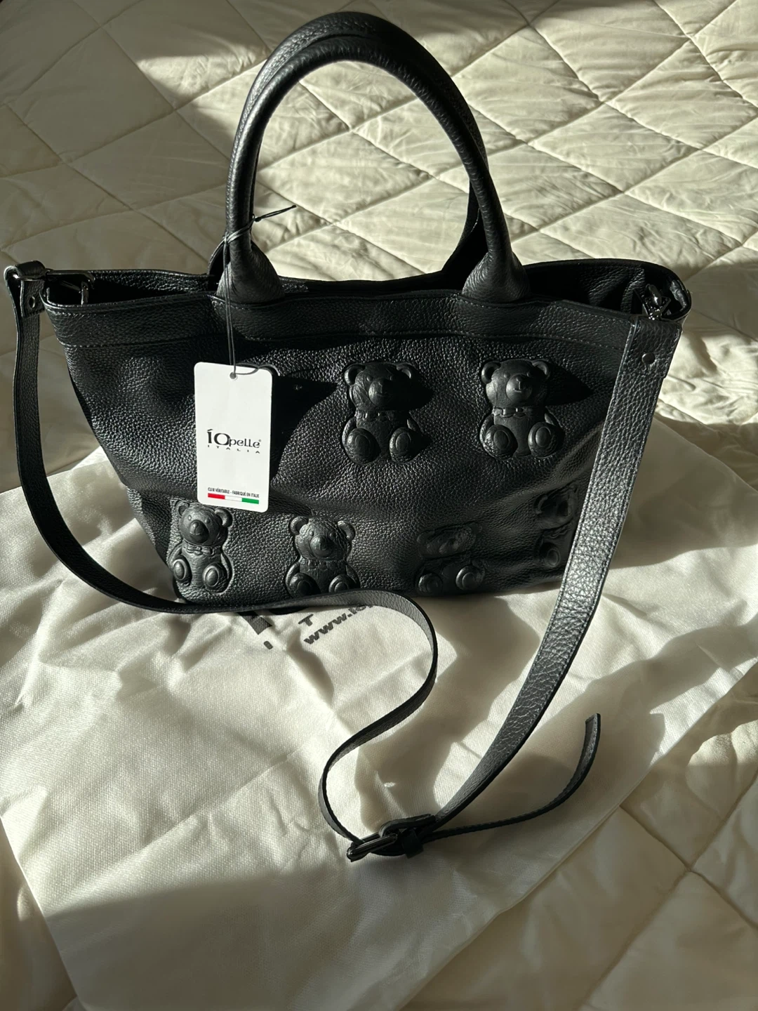 Looking to sell this IO Pelle black leather tote bag. It features an adorable teddy bear embossed design. Comes with a shoulder strap and dust bag. The interior has several compartments for easy organization. Perfect for everyday use!