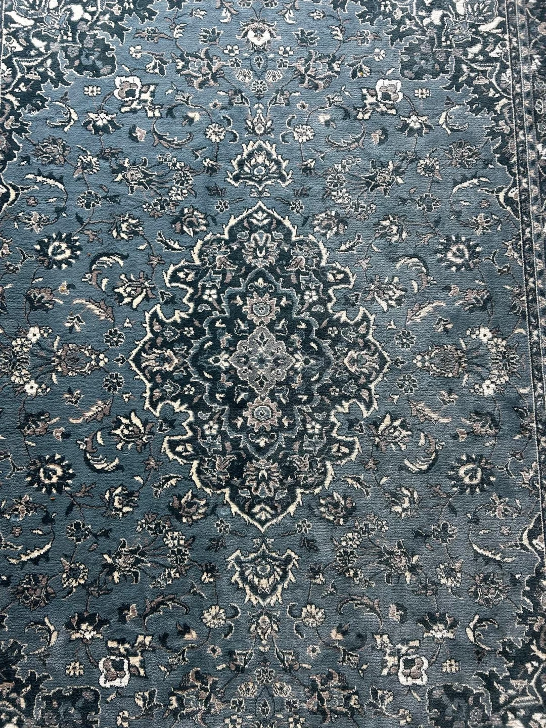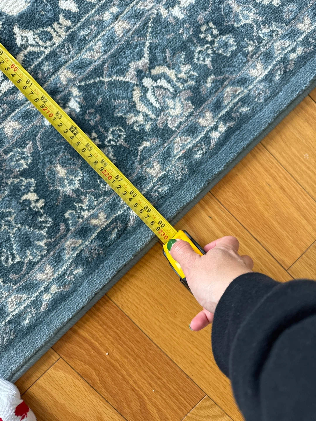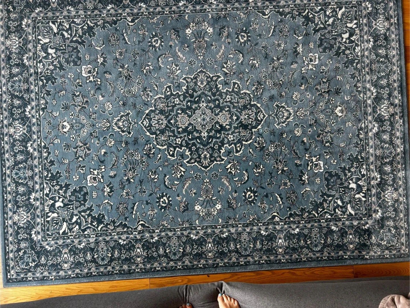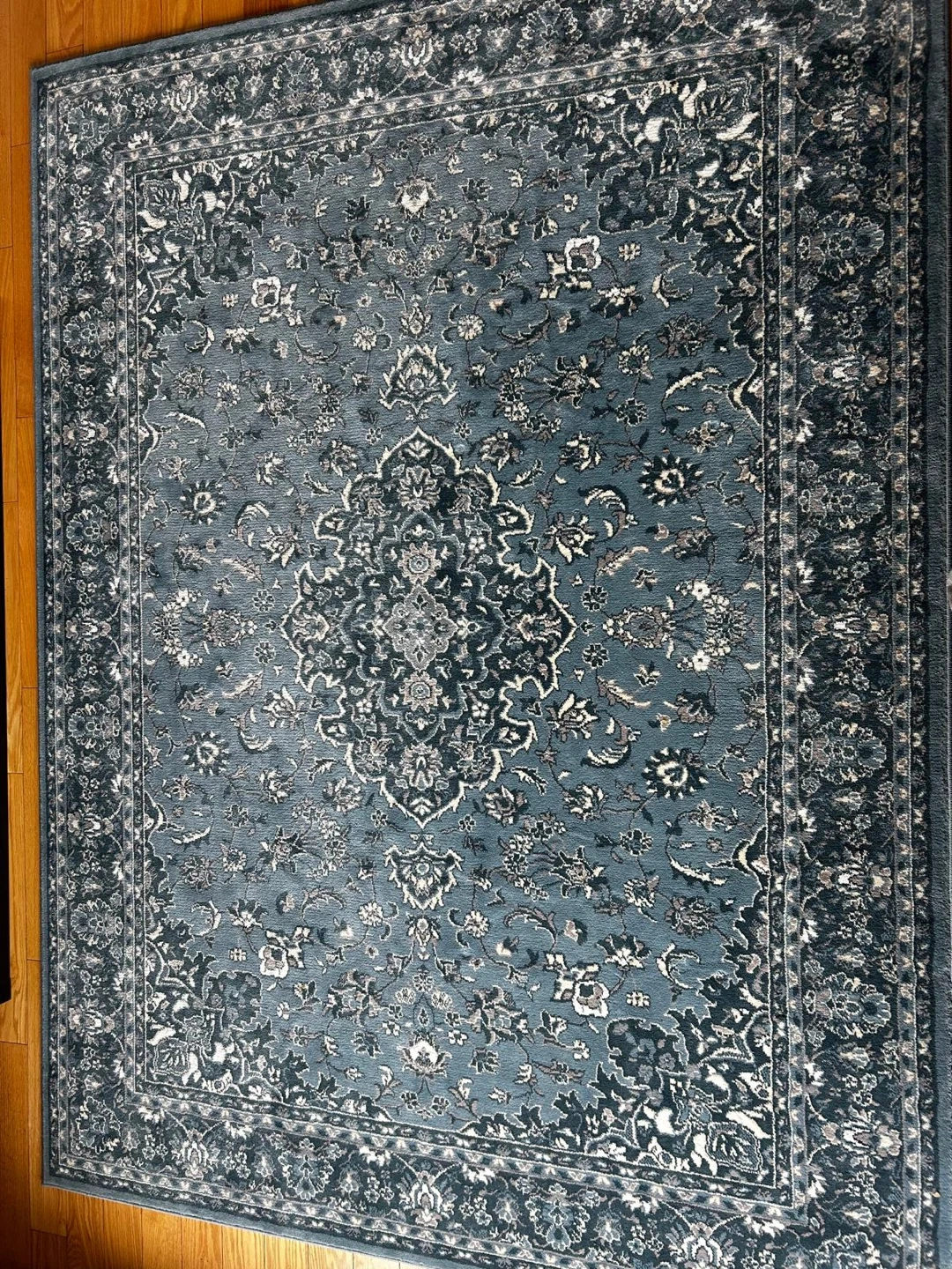 This is a beautiful blue area rug with a classic pattern. It measures approximately 90 inches in length and 63 inches in width. It's in perfect condition only used for a few months.