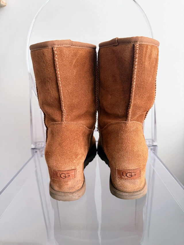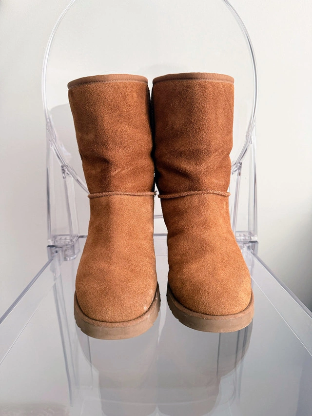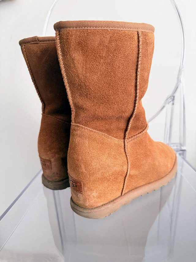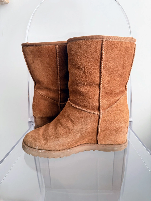 UGG brown wedge boots, size 8. They feature a comfortable hidden wedge heel and the classic UGG warmth. While they have been previously loved, they're ready for a new adventure. There are signs of wear, but they are still as comfy as ever. Let me know if you're interested!