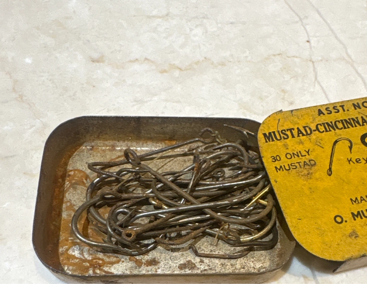 Vintage Mustad-Cincinnati Bass Hooks Asst. No. 121 in a metal tin. Contains approximately 30 fish hooks. Manufactured by O. Mustad & Son, Oslo, Made in Norway. Key Brand. Parkside Drive south of Bloor and keele station area