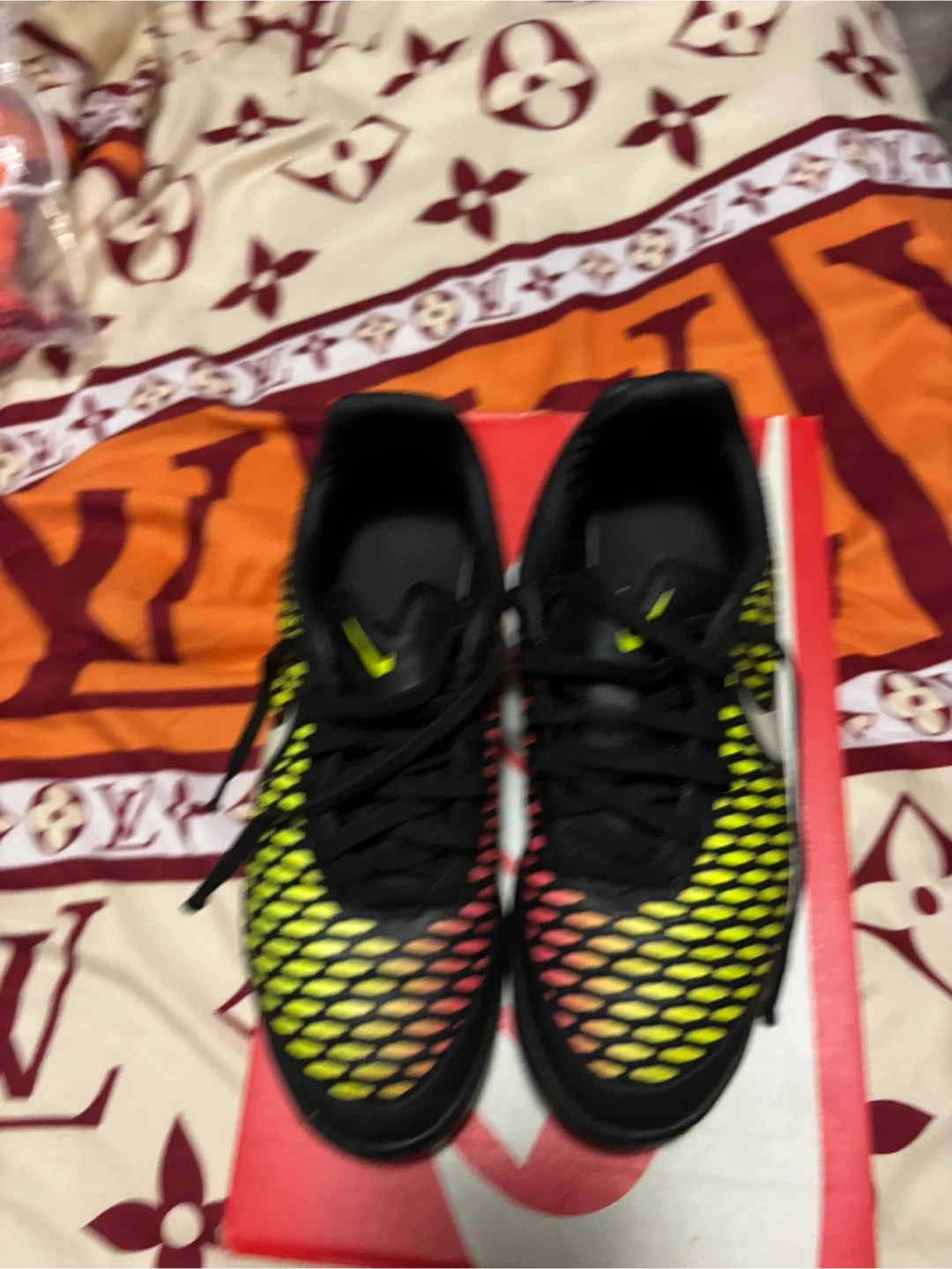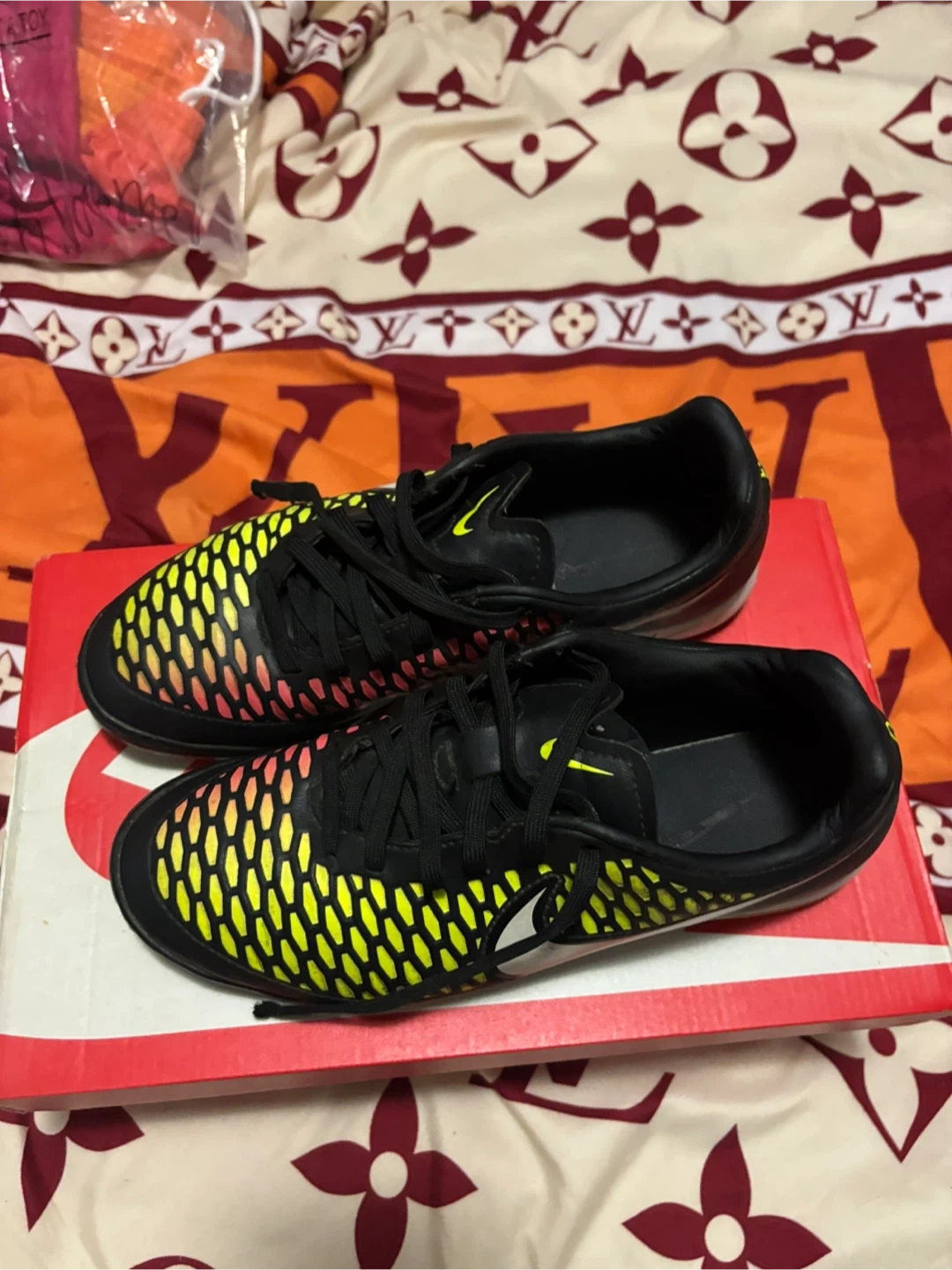 Selling a pair of Nike Priority Low soccer shoes in size 8. They're in good condition and come with the original box. The shoes feature a unique yellow and black pattern. Perfect for playing soccer or just kicking around!